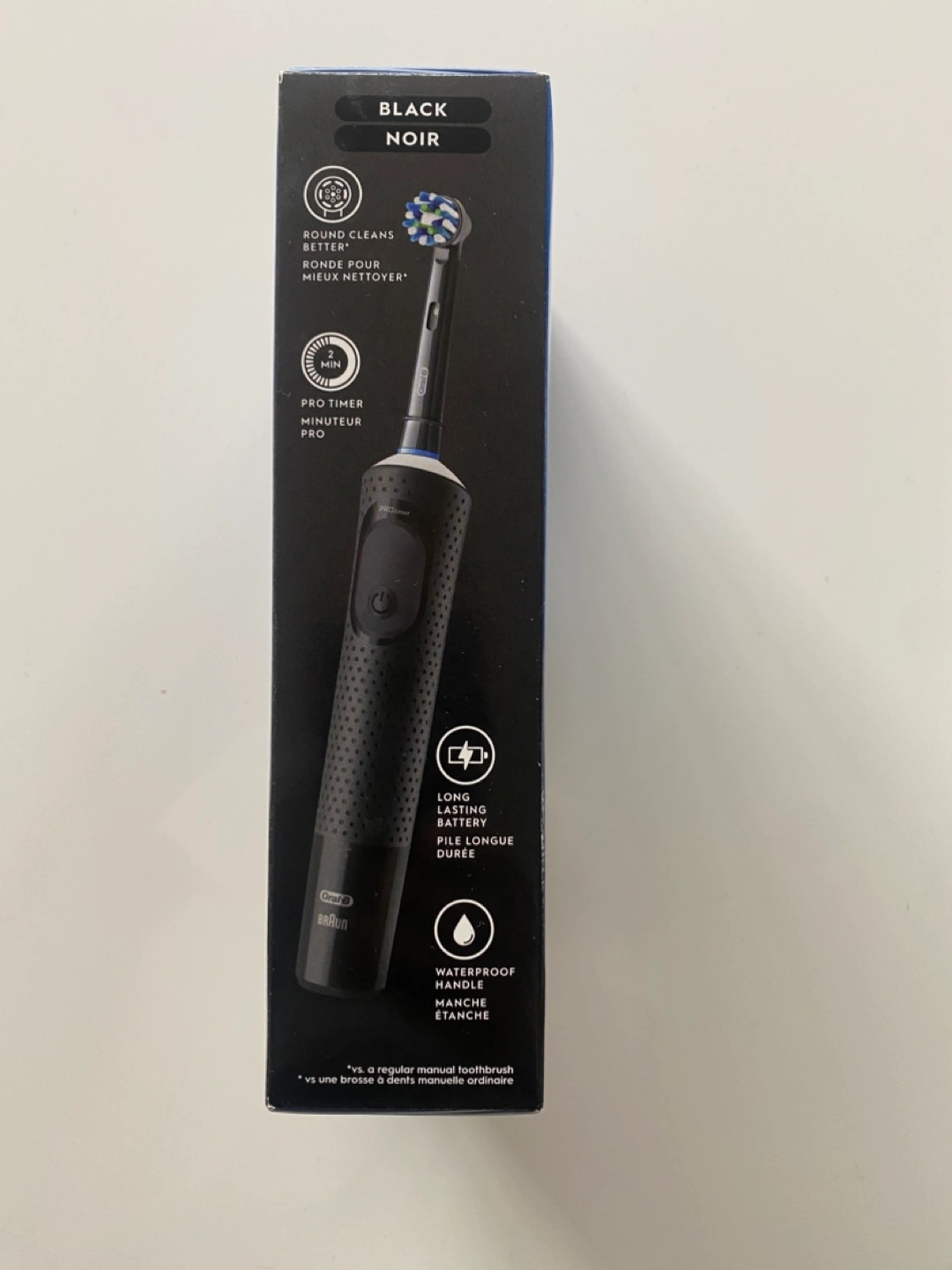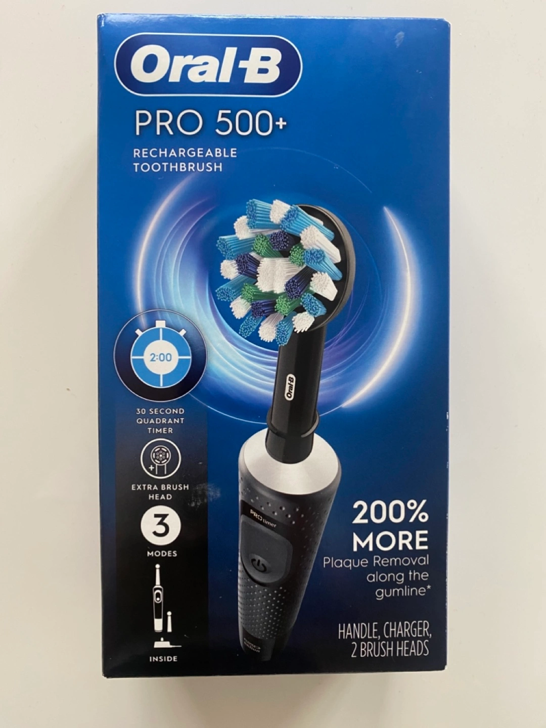 New Oral-B Pro 500+ rechargeable toothbrush. Black. Includes charger and two brush heads. Features three modes and a 30-second quad timer. Long-lasting battery. Waterproof handle.