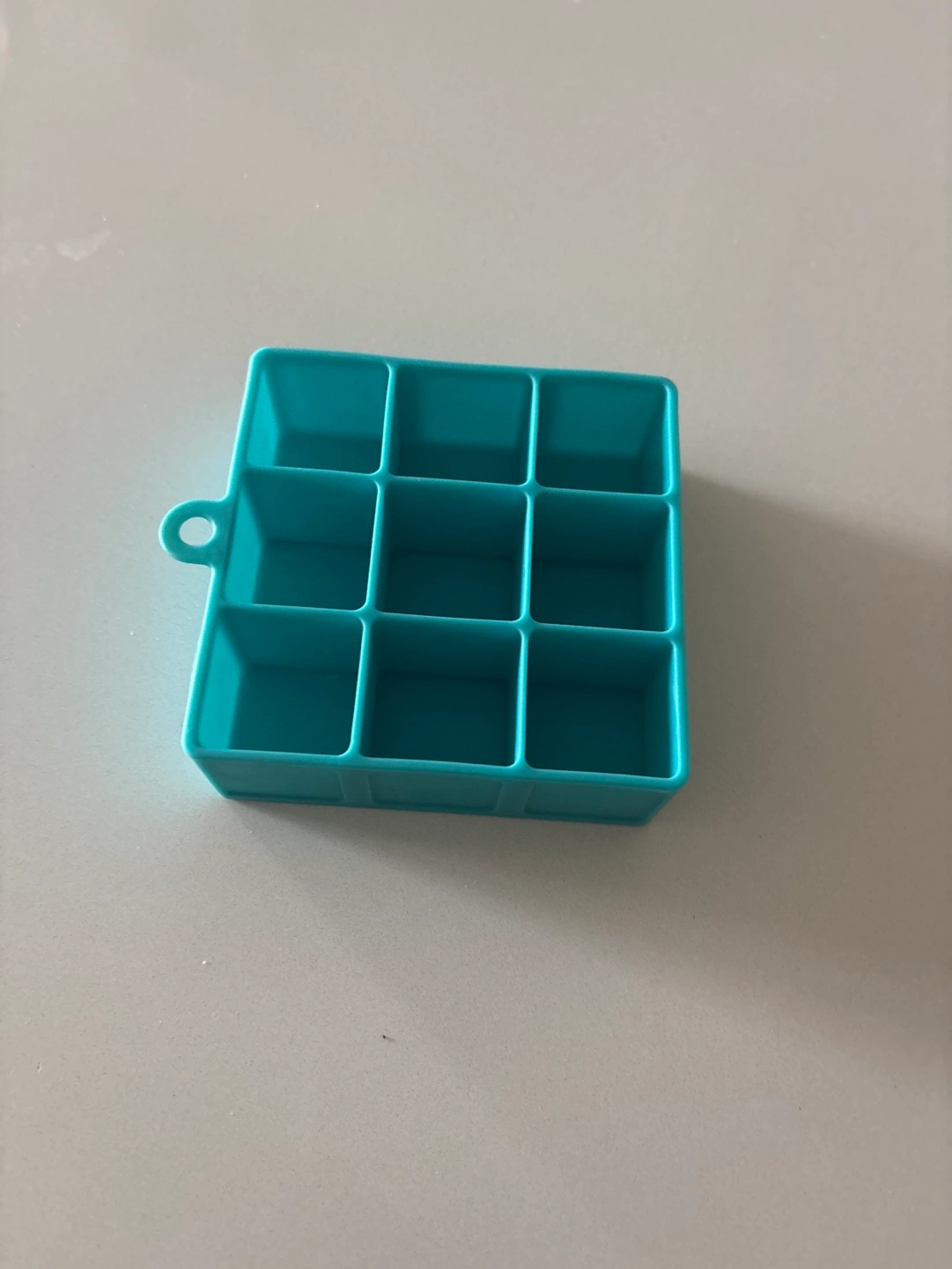 Silicone ice cube tray. Twelve individual cube molds. Small hanging loop.