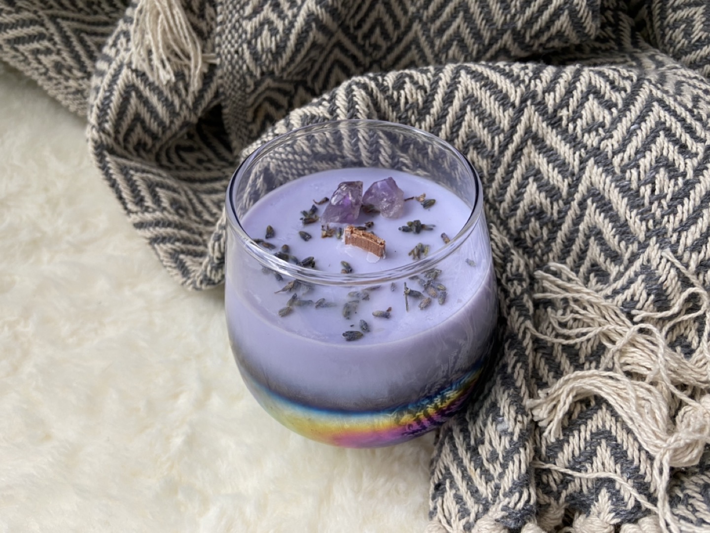 Handmade healing candle with wooden wick, dried lavender and amethyst crystals.