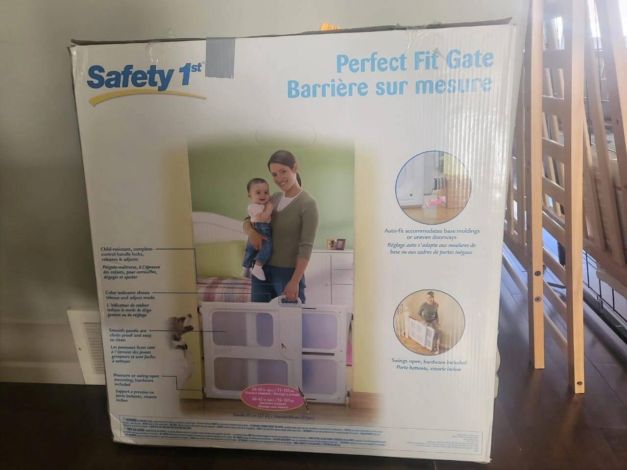 New, not open Baby gate, pressure mounted. Auto-fit accommodates base moldings or uneven doorways. Easy to install and use. Great for hallways and doorways.