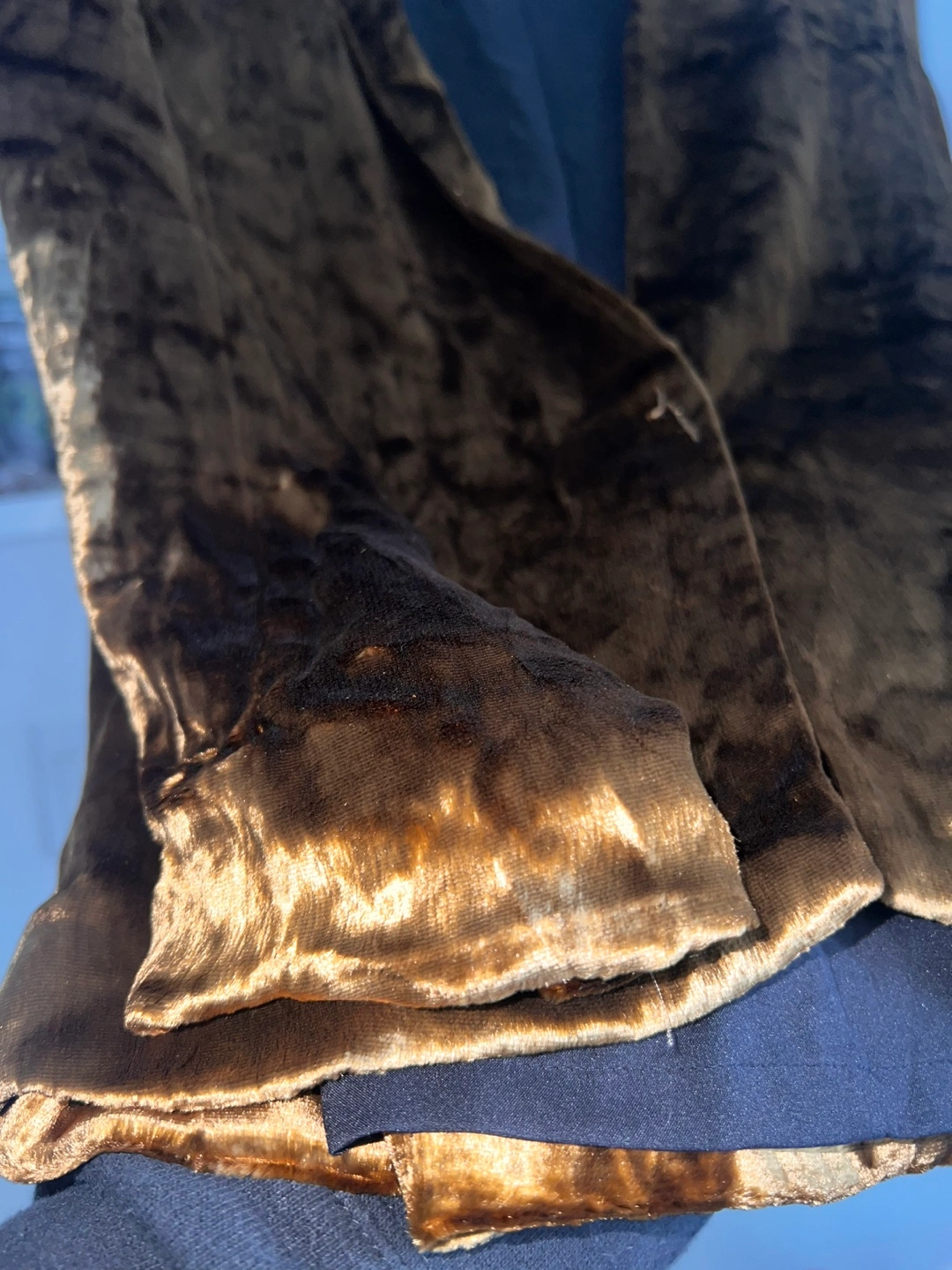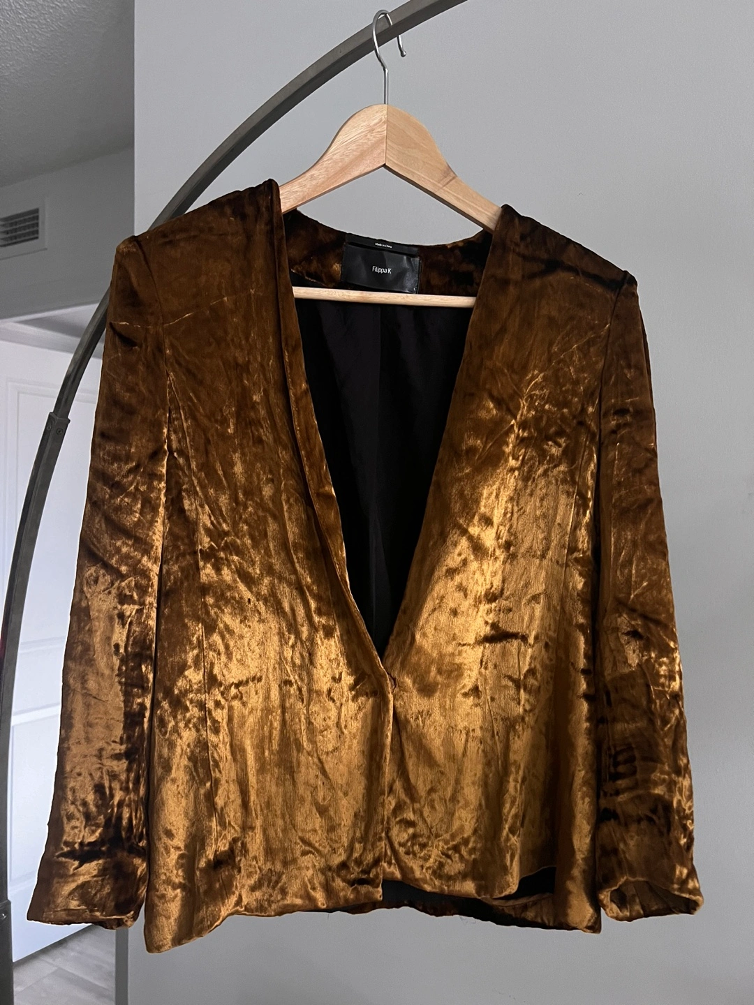 Gorgeous gold velvet blazer Three-quarter sleeves. Open front. Relaxed fit. Made in China. 88% Rayon/12% Silk.