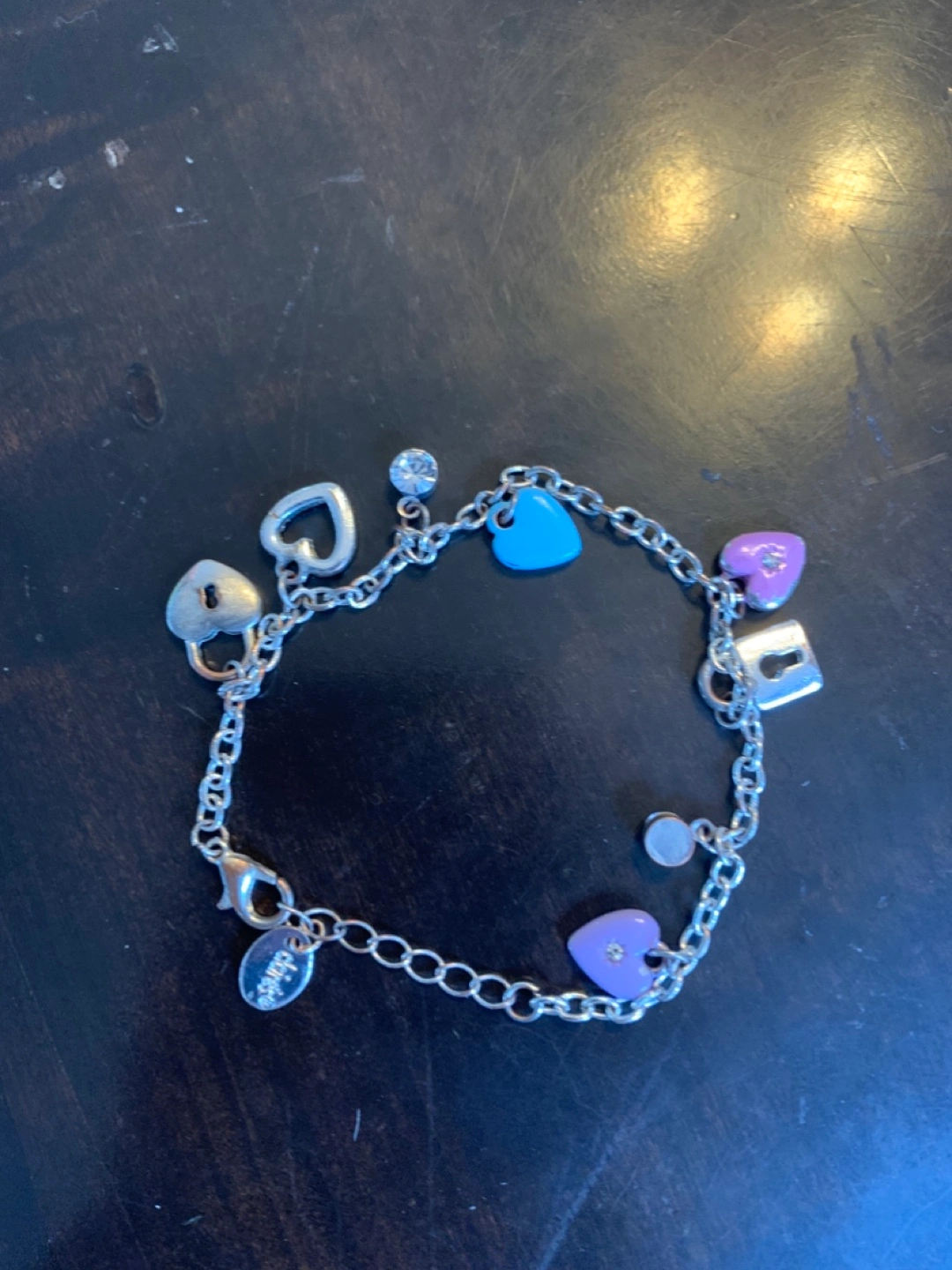 Silver chain bracelet. Features colourful heart and lock charms. Small clear stone accent. Lobster clasp closure. Cute and delicate.please check out my other listings .