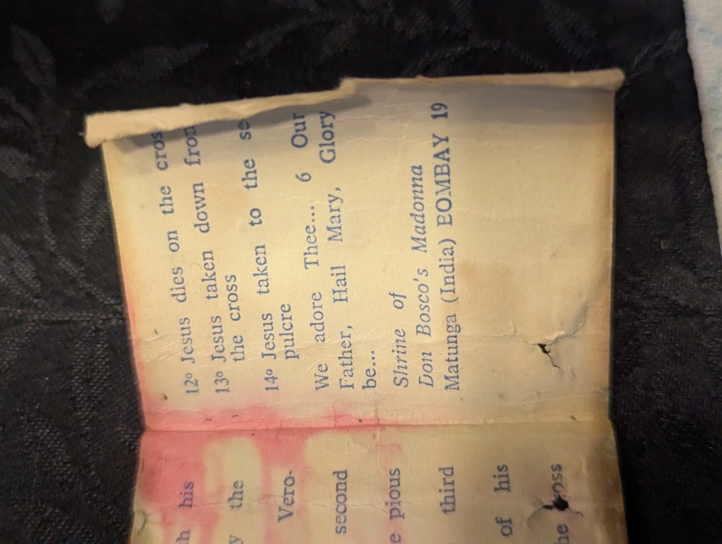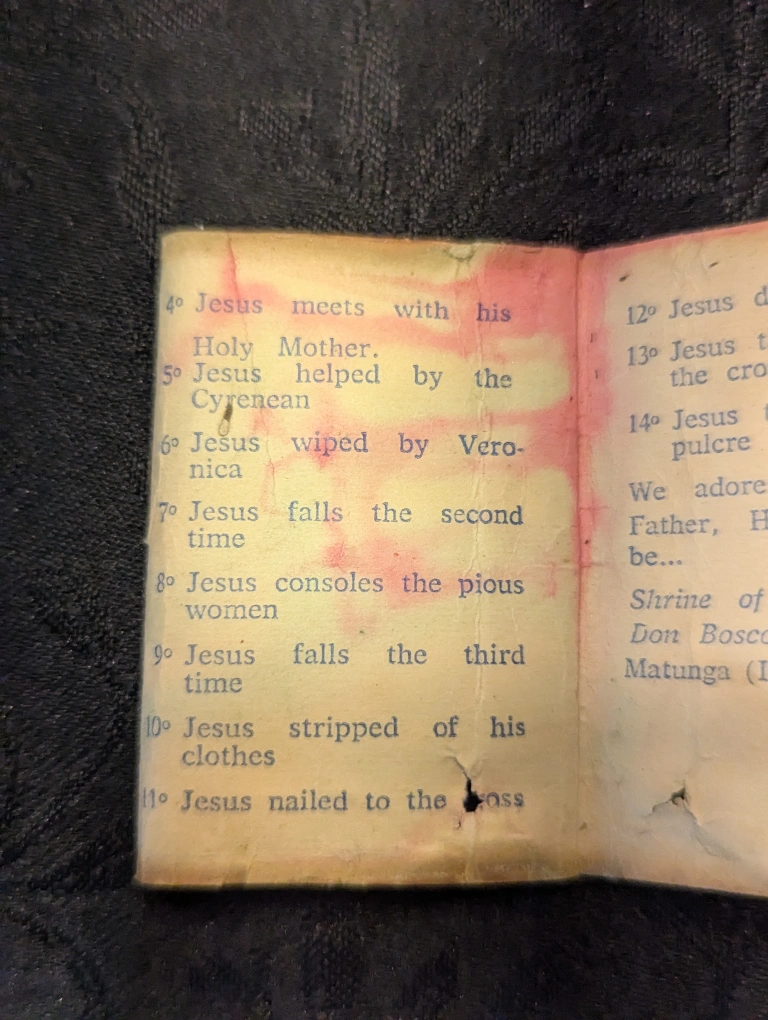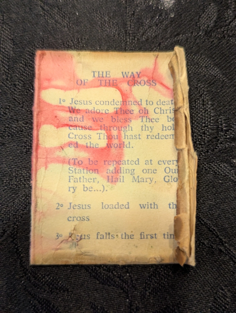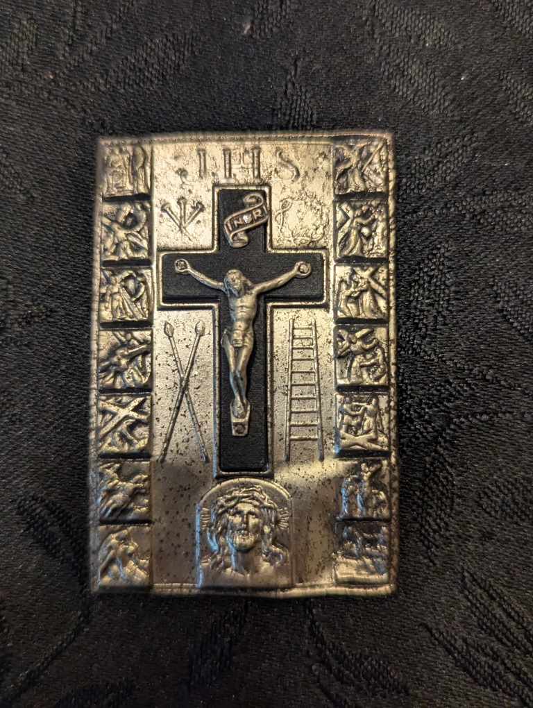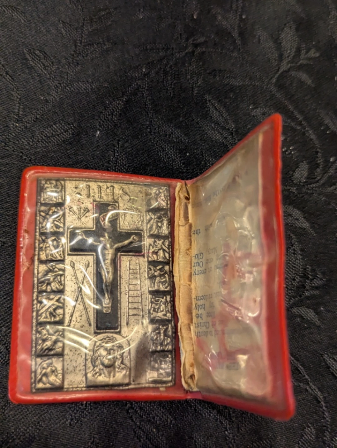 Antique- booklet detailing the Stations of the Cross. Includes a small metal crucifix featuring Jesus on the cross with various scenes depicted around the central image. Booklet shows age and wear. it is from the mid-1900s