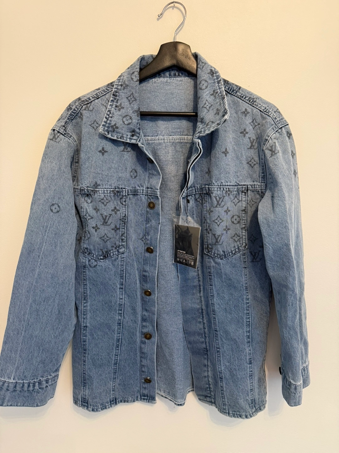 149Light wash denim jacket. Features an all-over Louis Vuitton monogram print. Button closure. Long sleeves. Two chest pockets. Fake