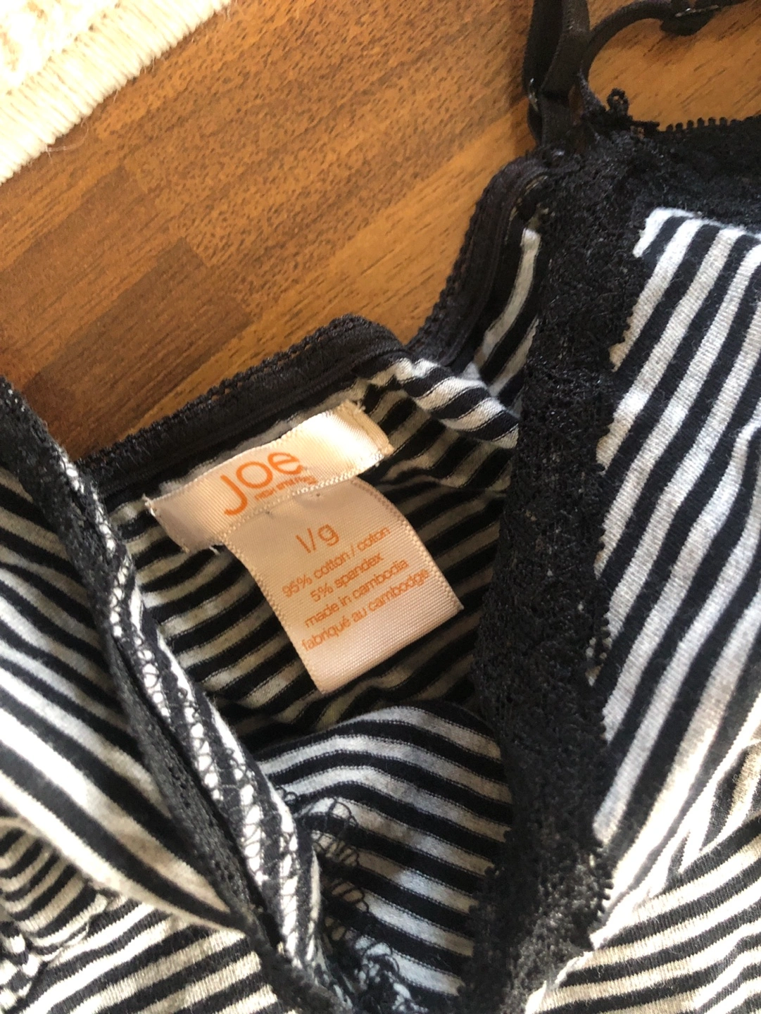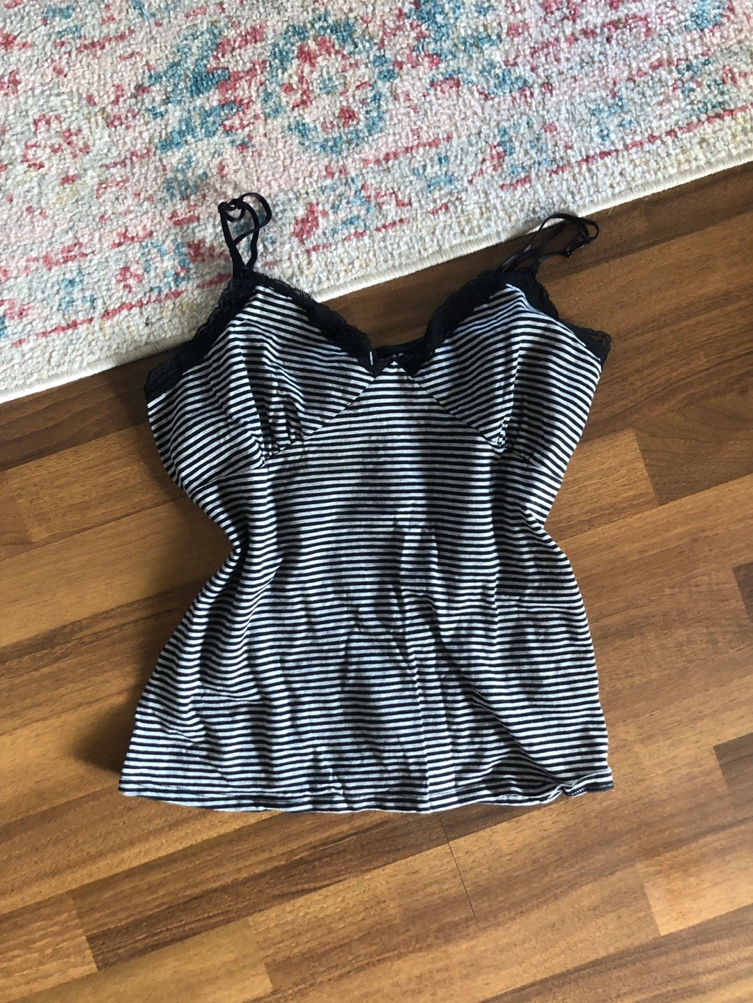 Black and white striped cami. Features delicate black lace trim. Size small. 95% cotton, 5% spandex. Made in Cambodia.