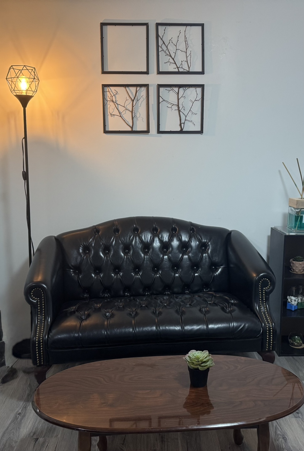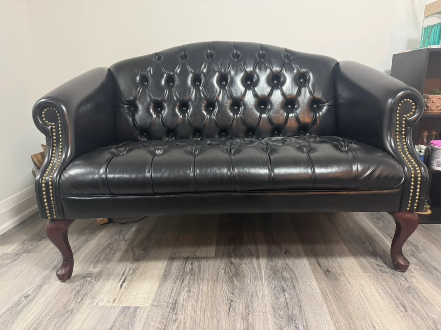 Elegant black leatherette loveseat, button-tufted. Features rolled arms and nailhead trim. Matching oval wood coffee table, simple design. Perfect for a small space.
