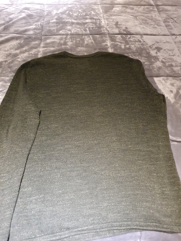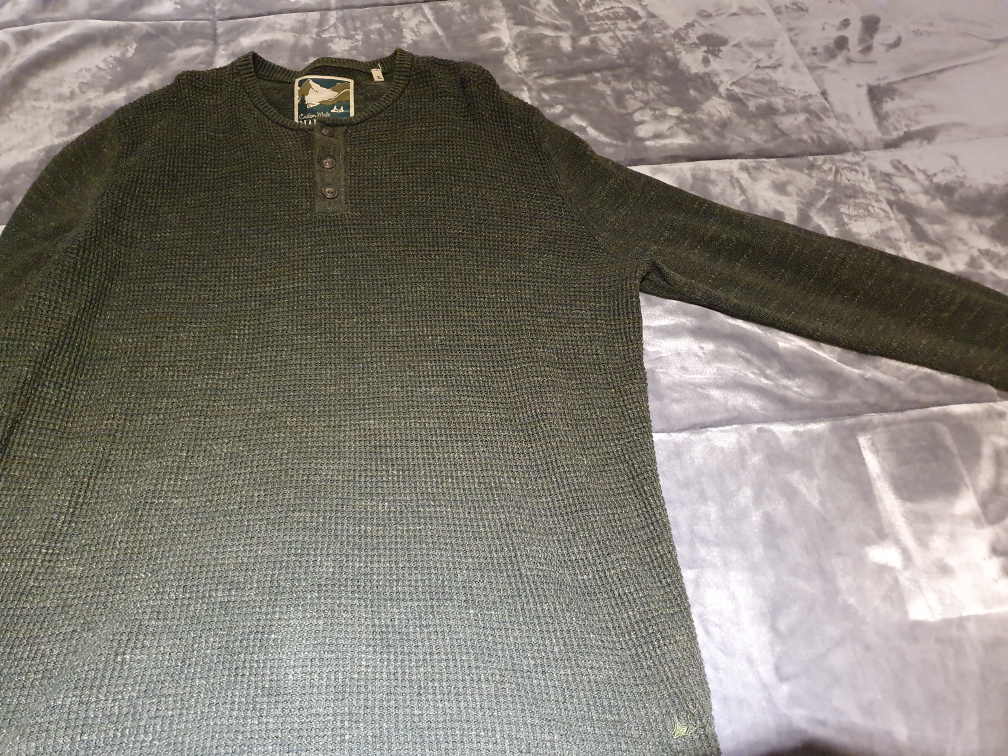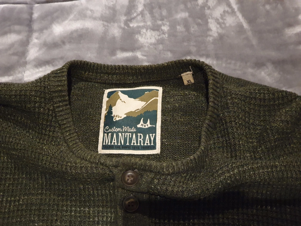 Dark green waffle knit henley long sleeve sweater. Size XL. Button placket. Custom Made MantaRay label. Travel the roads less travelled.