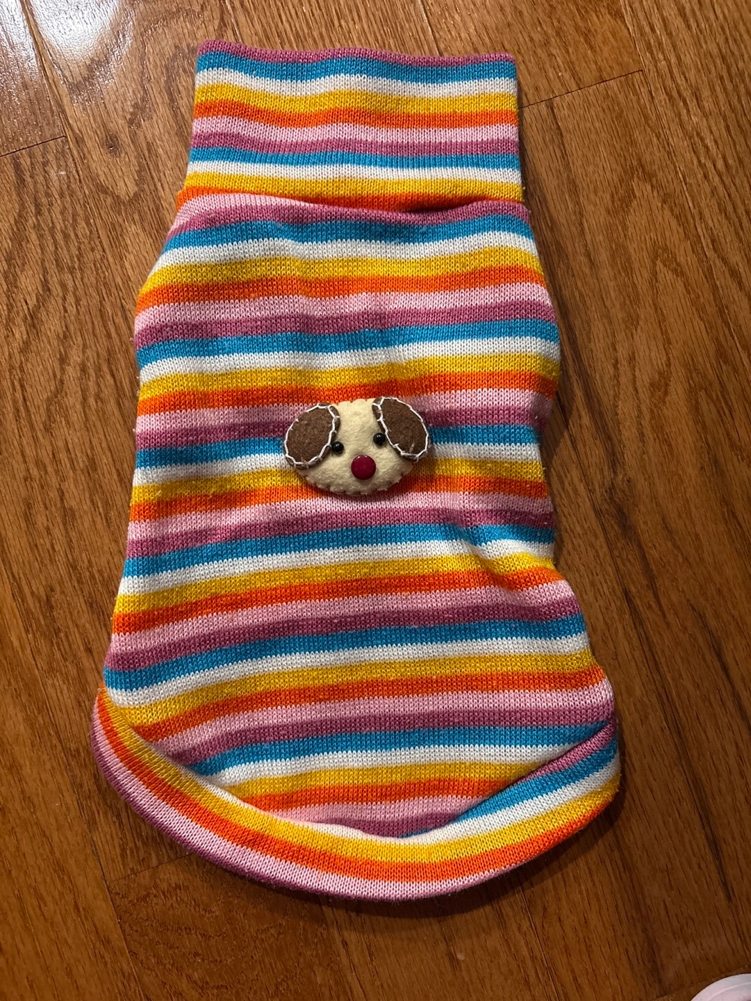 Cute dog sweater. Rainbow coloured stripes. Small dog applique on the front. Good condition. Soft material.