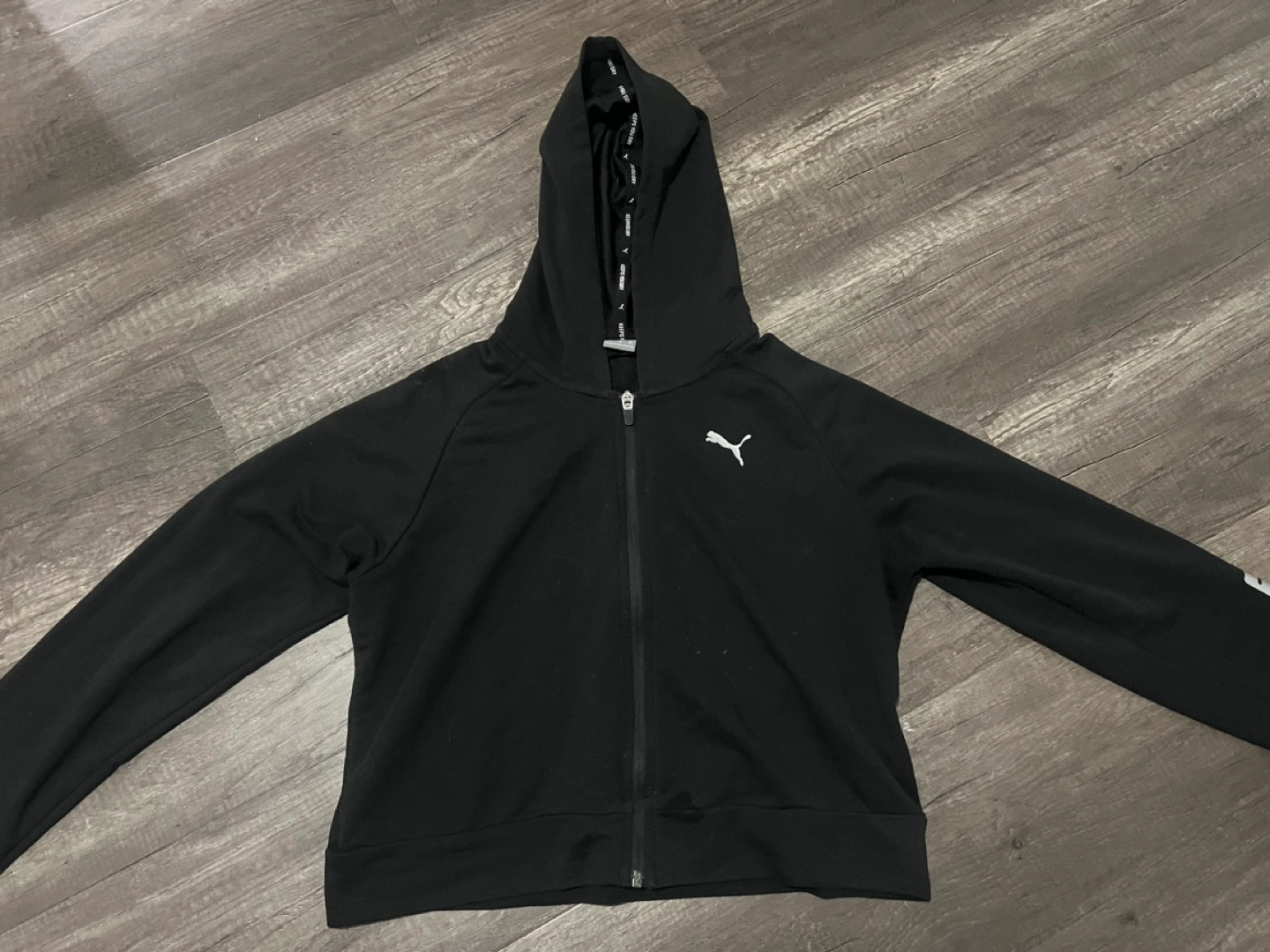 37Women's black zip-up hoodie. Features a Puma logo and branding details. Great for workouts or casual wear.