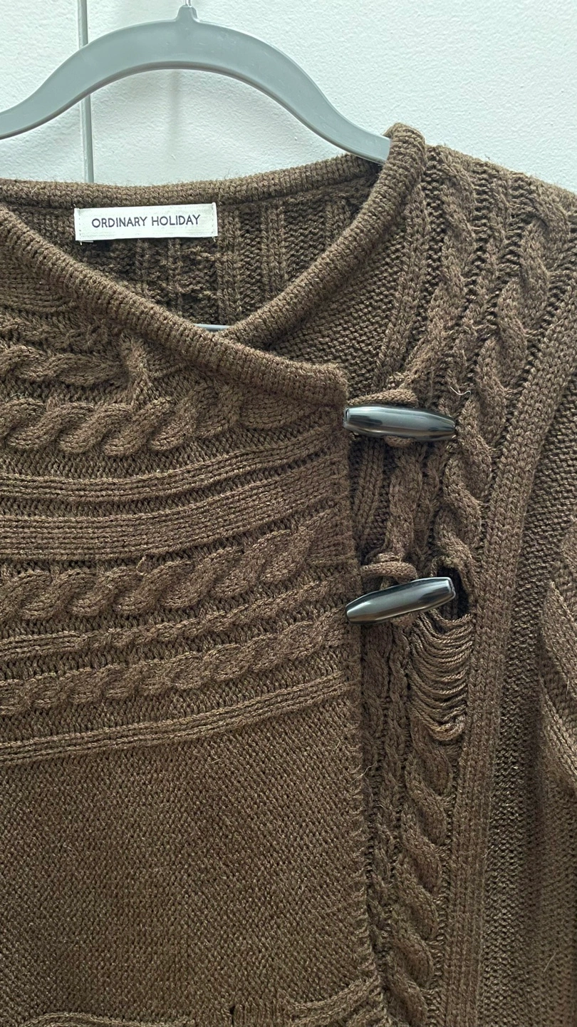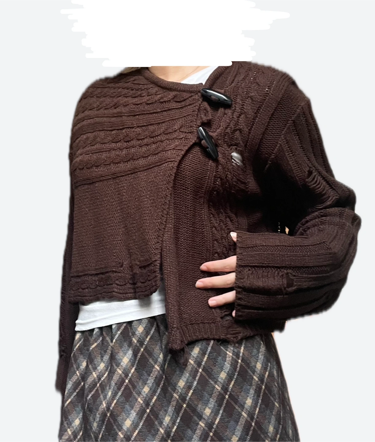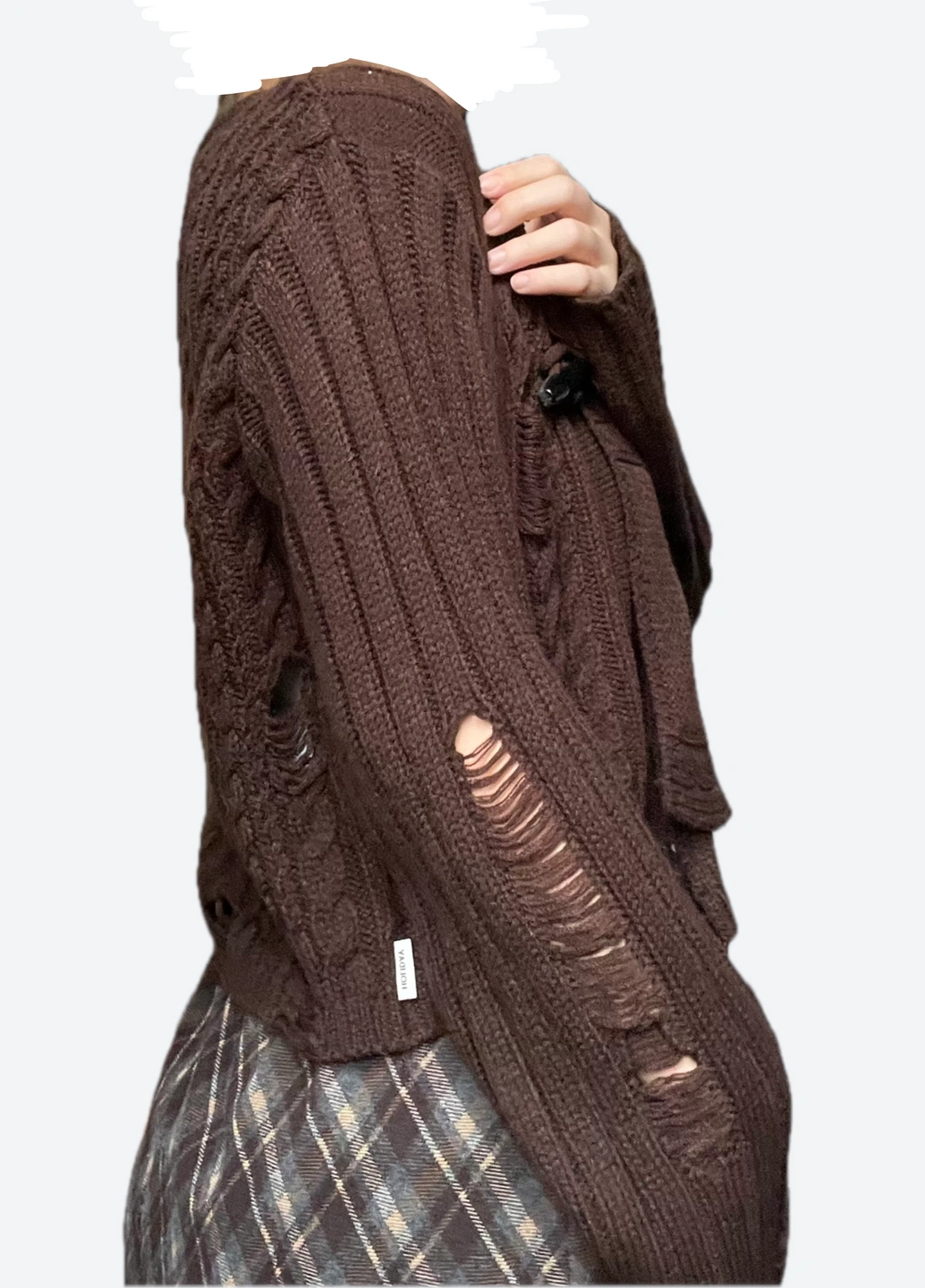 Dark brown cropped cable knit cardigan. Features distressed detailing and black toggle closures. Long sleeves. Relaxed fit with 2 buttons in the front, 1 hidden behind front closure.