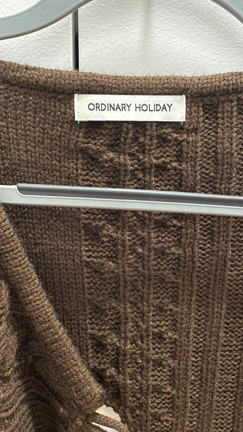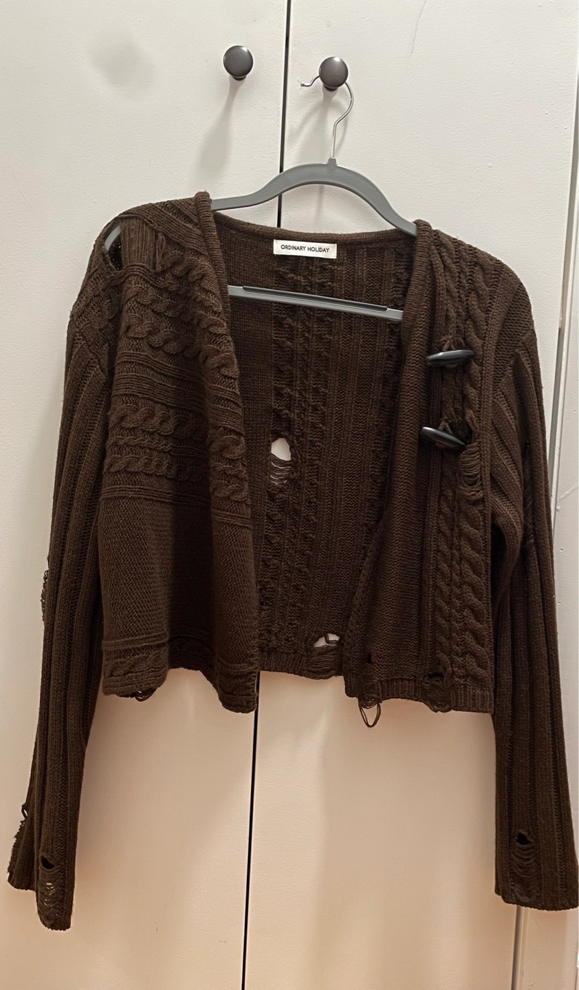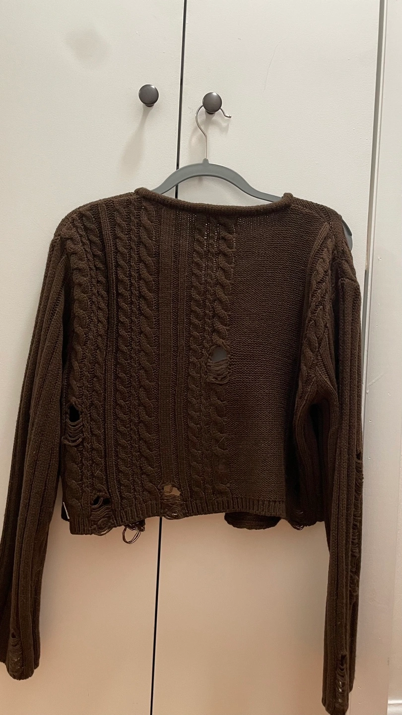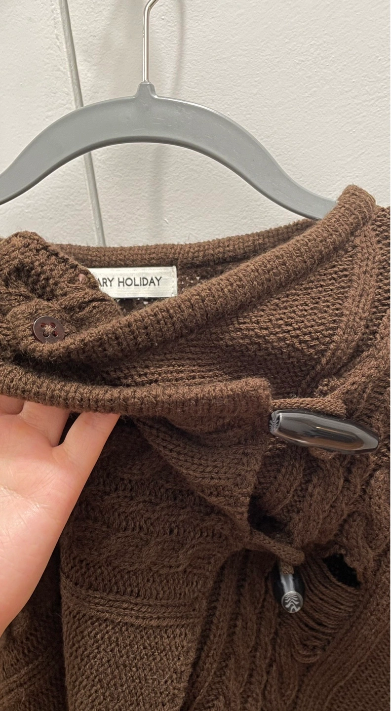 Dark brown cropped cable knit cardigan. Features distressed detailing and black toggle closures. Long sleeves. Relaxed fit with 2 buttons in the front, 1 hidden behind front closure.