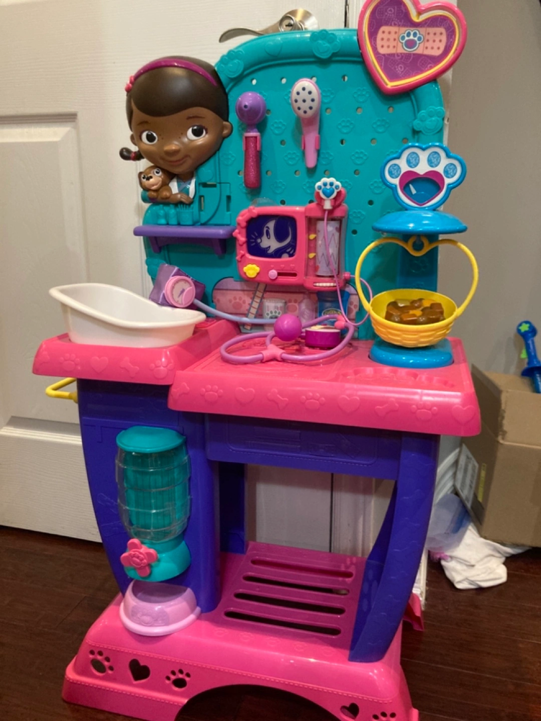 Adorable Doc McStuffins pet vet clinic. Features a working examination table, various medical tools, and pet accessories. Great for imaginative play. Includes a Doc McStuffins head and some small animals.
