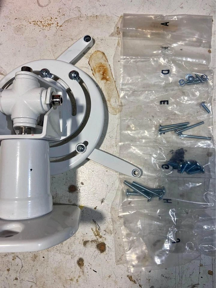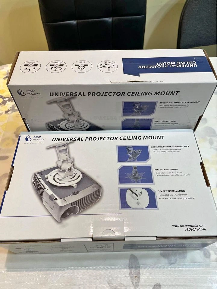 New universal projector ceiling mount. White finish. Includes all mounting hardware. Angle adjustable. Simple installation. Perfect for various projectors.