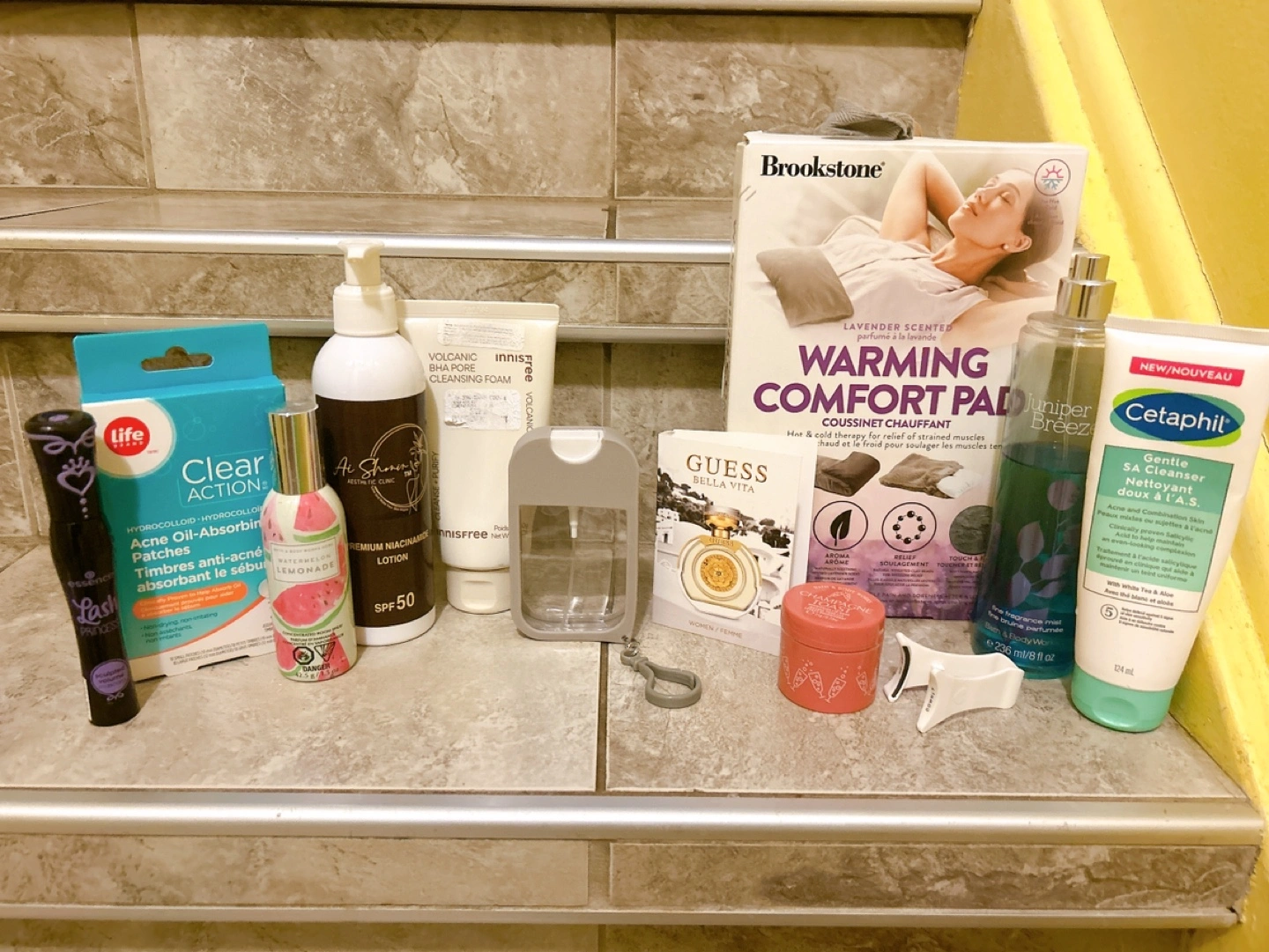 Assorted beauty and wellness products. Includes face cleanser, lotion, pimple patches, mascara, eyeliner, hand sanitizer, perfume samples, eyelash curler, and a warming comfort pad. Various brands included.