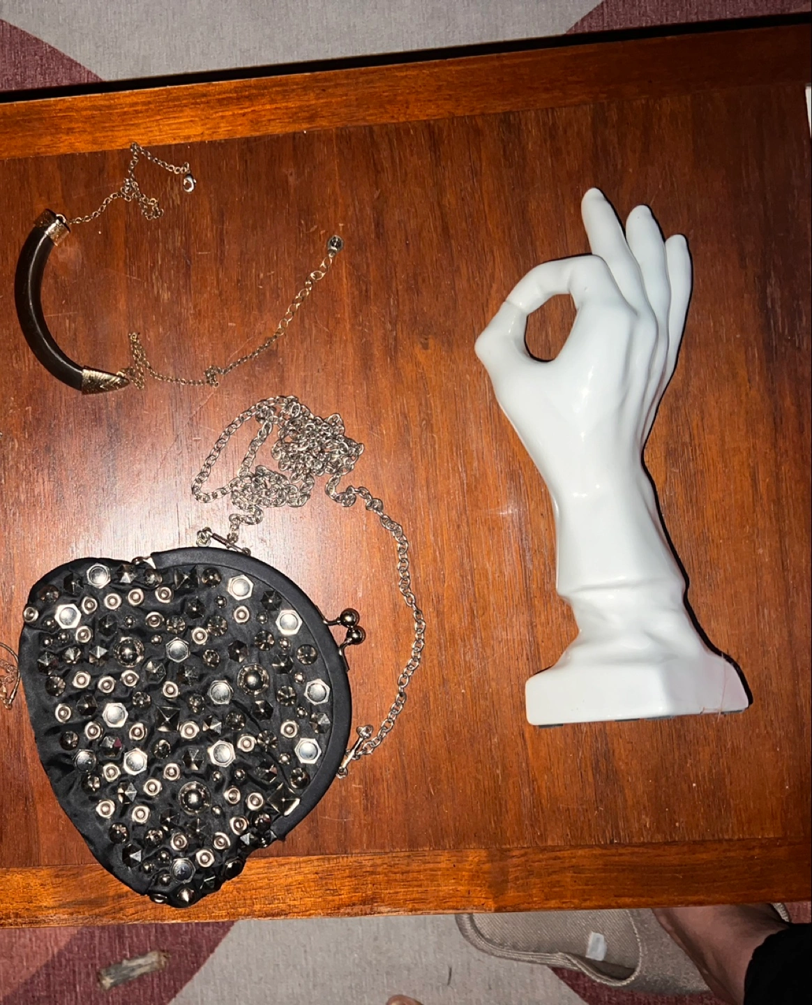 Necklaces, ceramic decor and a studded purse. Various styles and colours.
