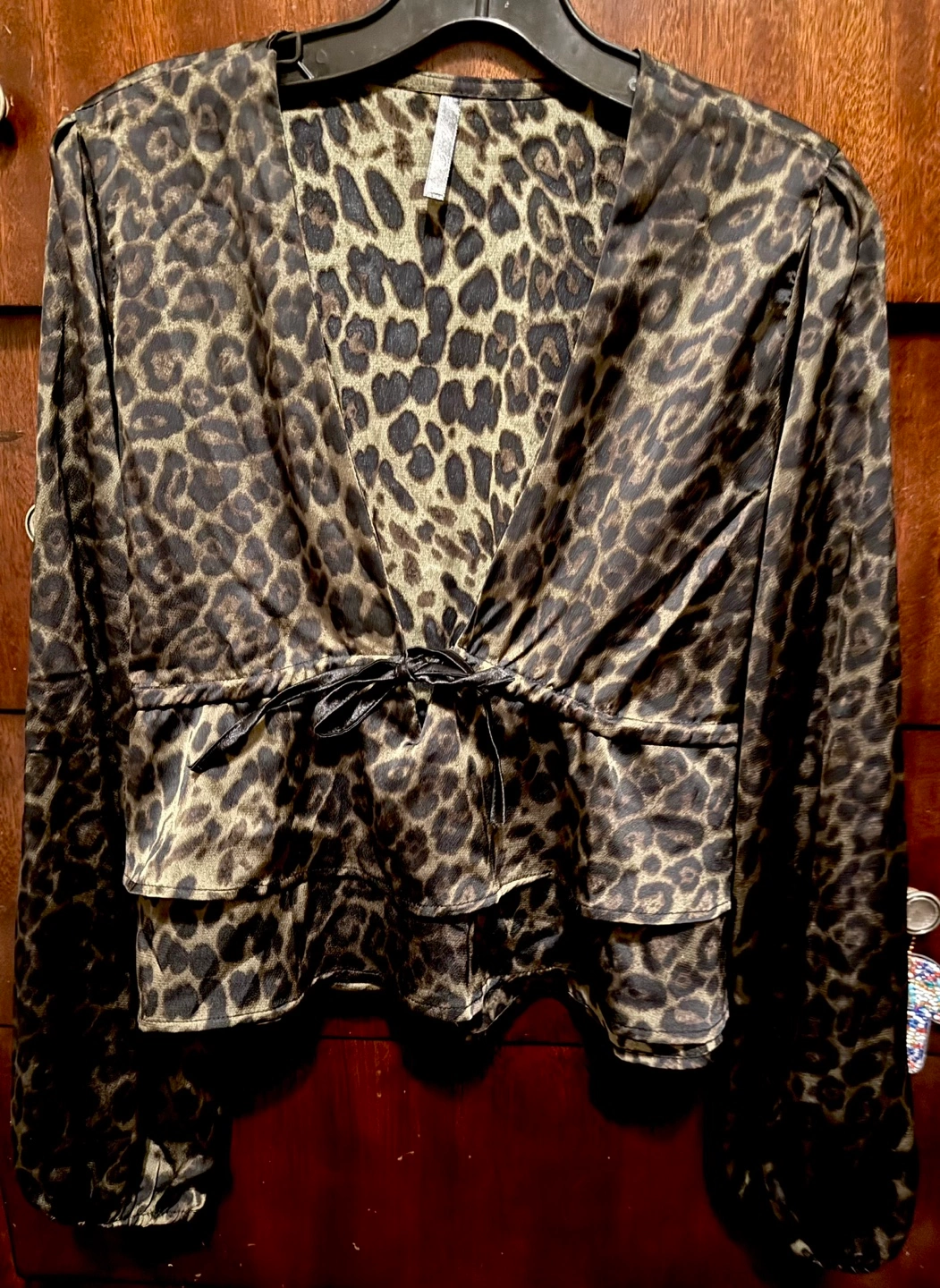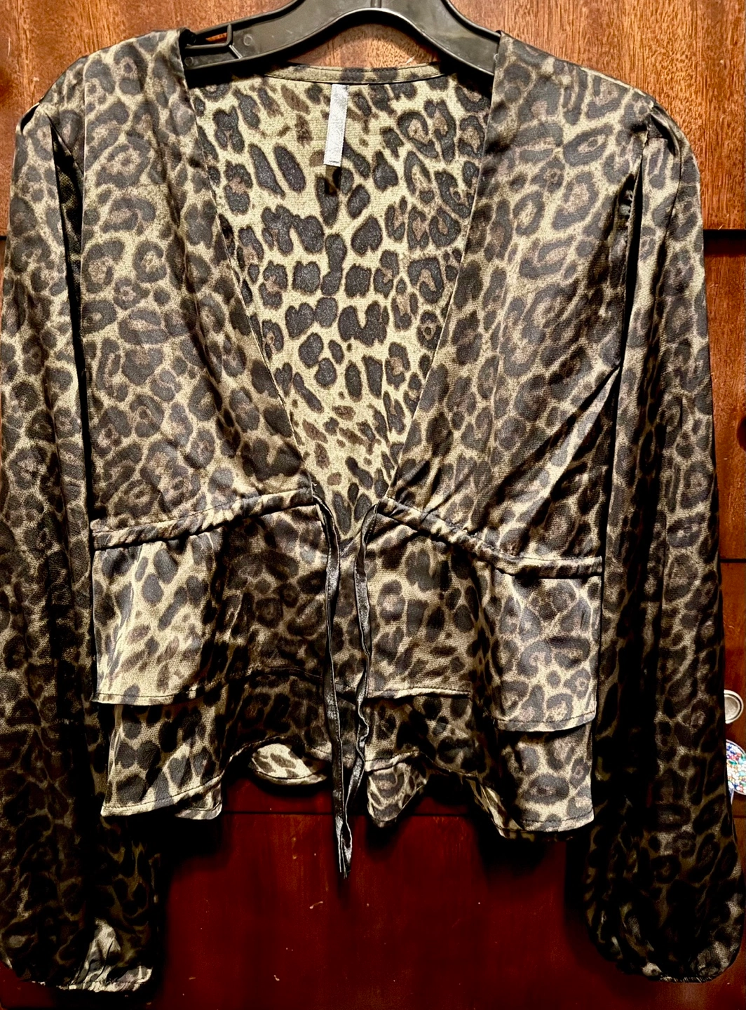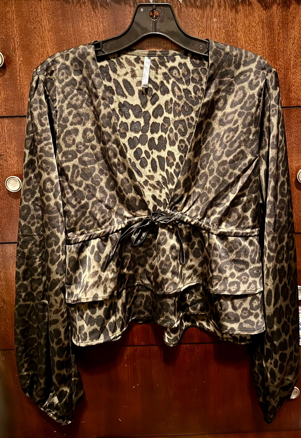 Long sleeve, V-neck, cropped blouse. Features a tiered ruffle hem and drawstring waist. Satin-like material. Leopard print. Perfect for a night out or a casual look.