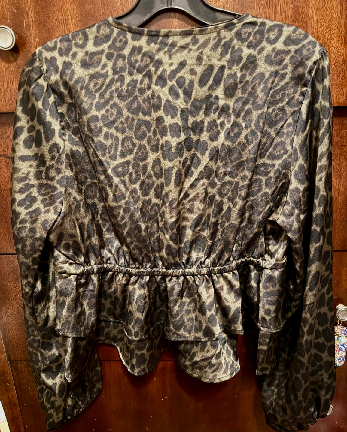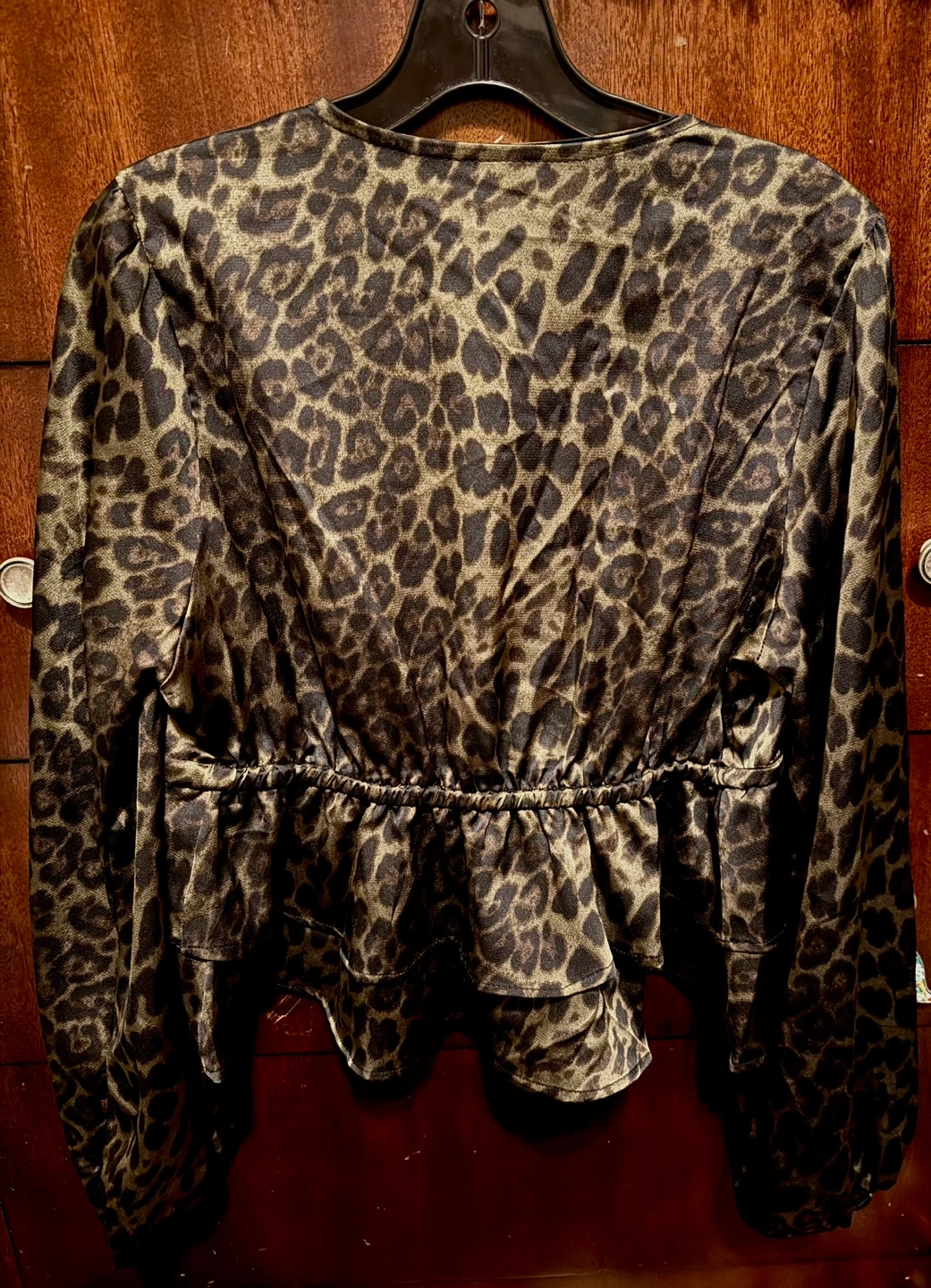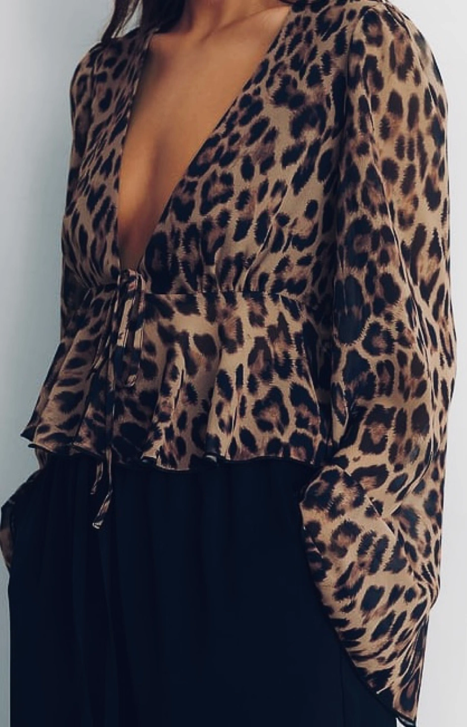 Long sleeve, V-neck, cropped blouse. Features a tiered ruffle hem and drawstring waist. Satin-like material. Leopard print. Perfect for a night out or a casual look.