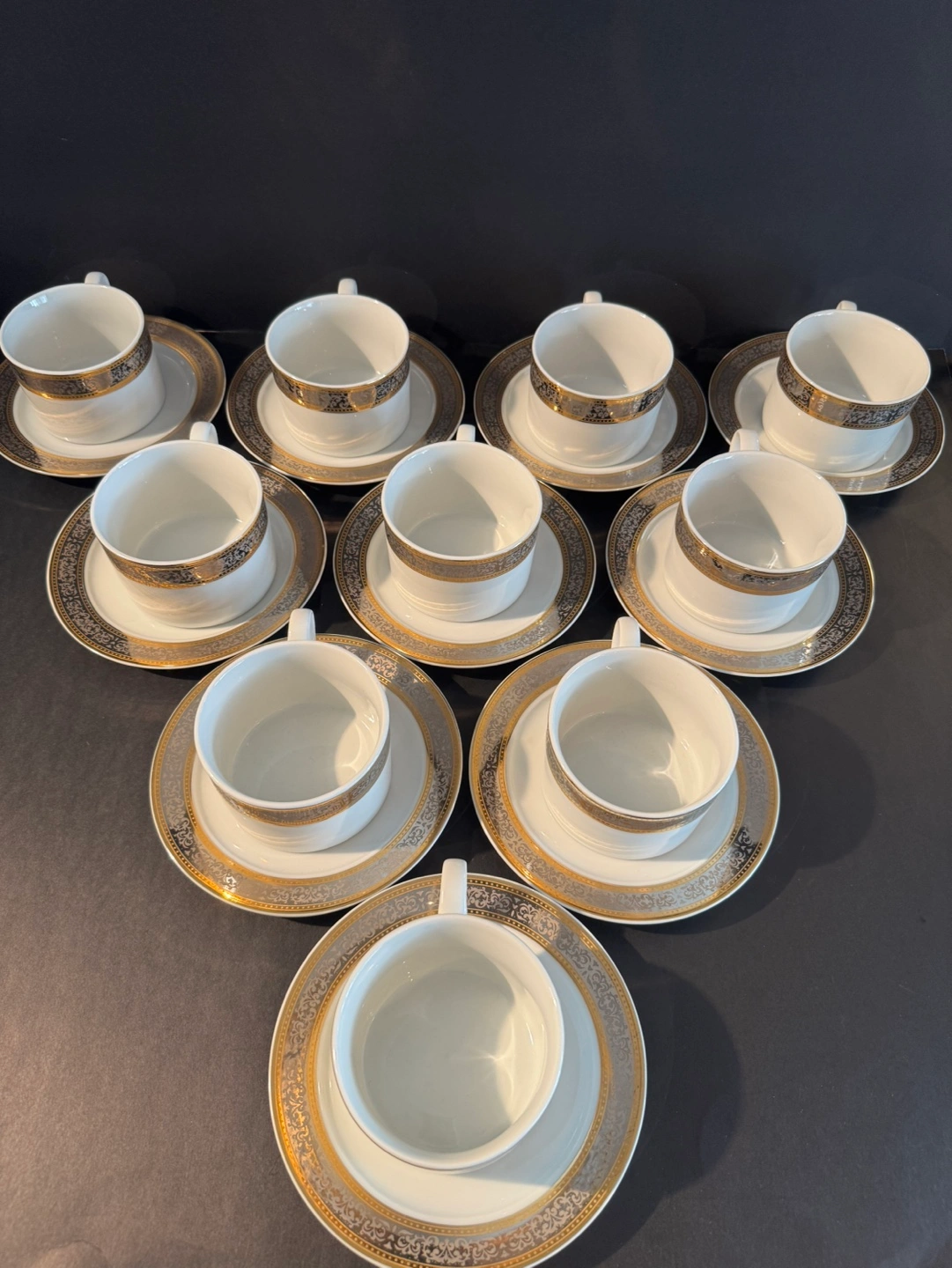 Elegant teacup and saucer set. Twenty pieces total. Features gold and silver detailing. White porcelain. Perfect for afternoon tea or a special occasion.
