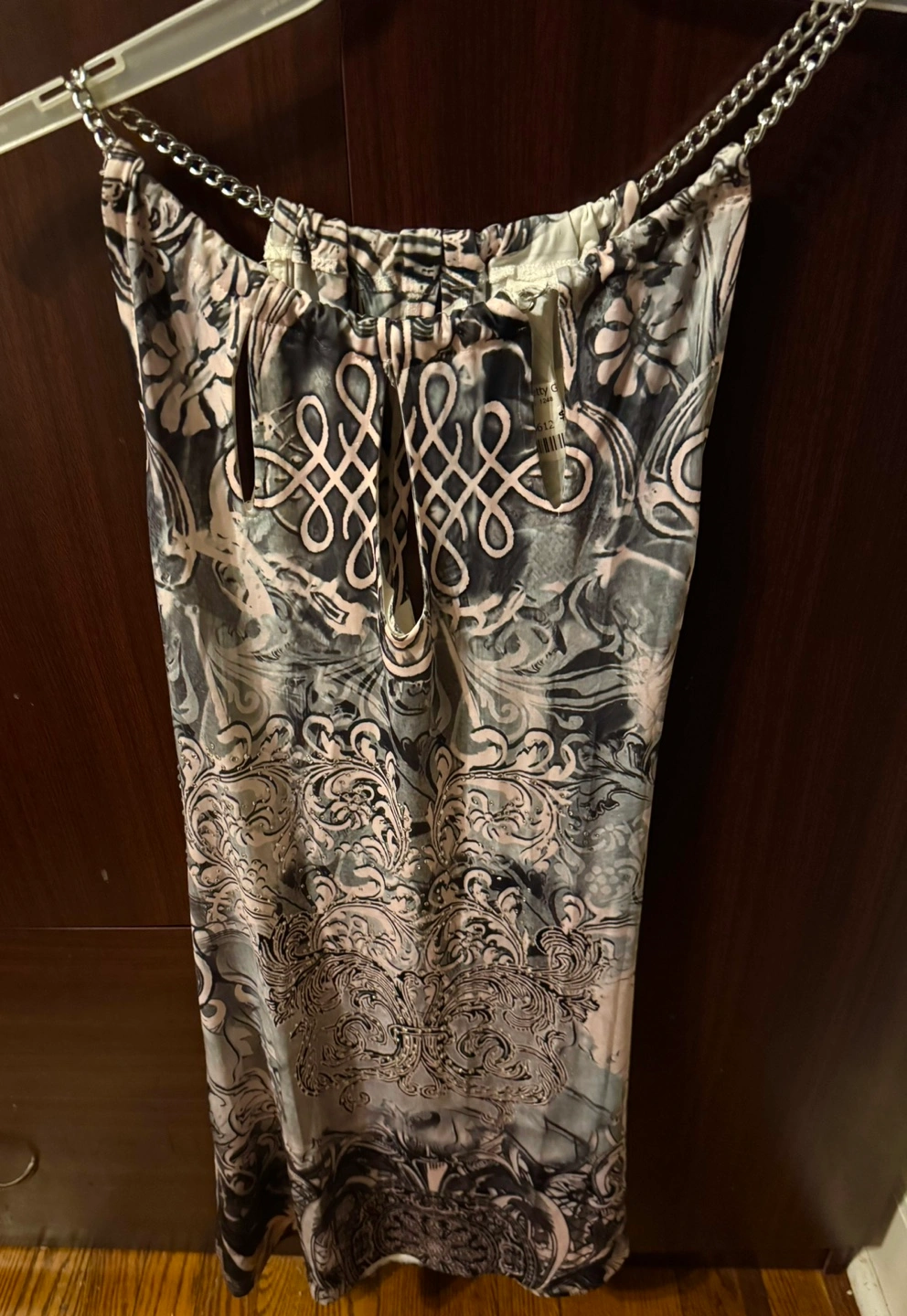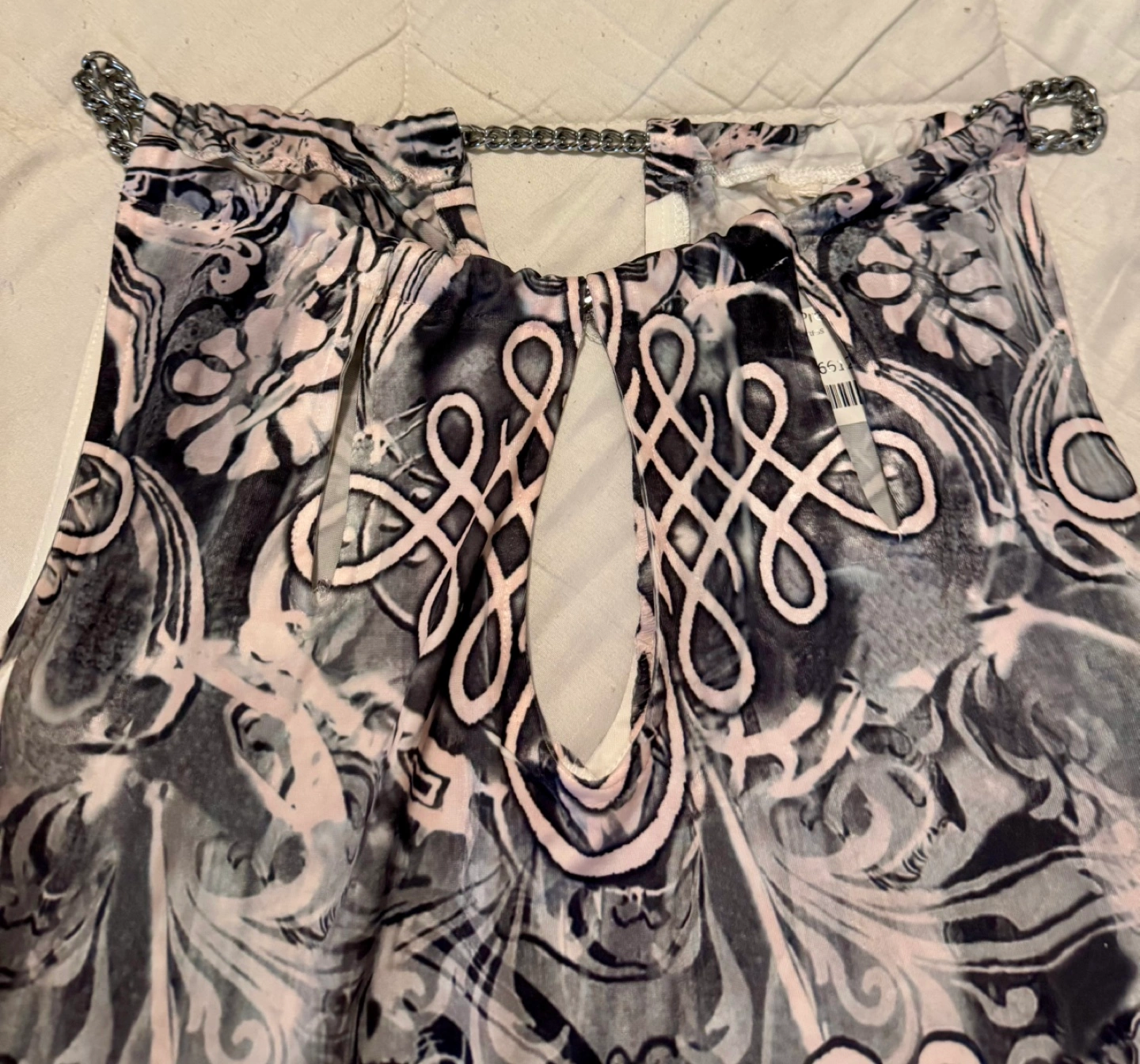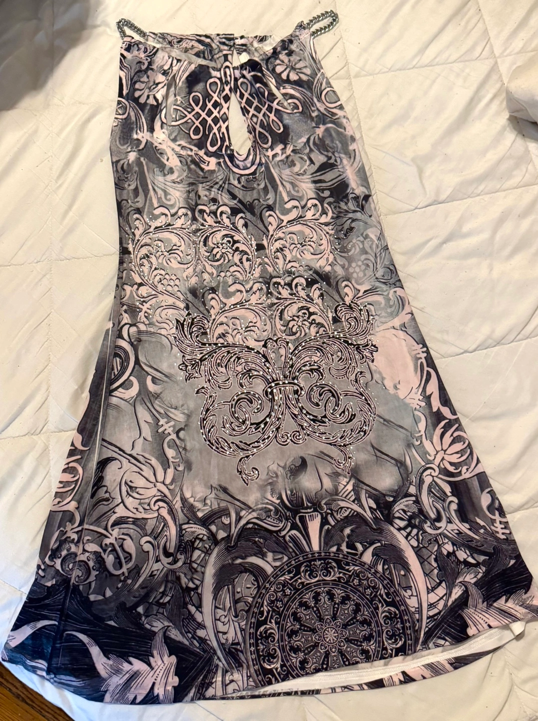 Stunning sleeveless dress. Features a beautiful black pink and white print, keyhole neckline, rhinestones,