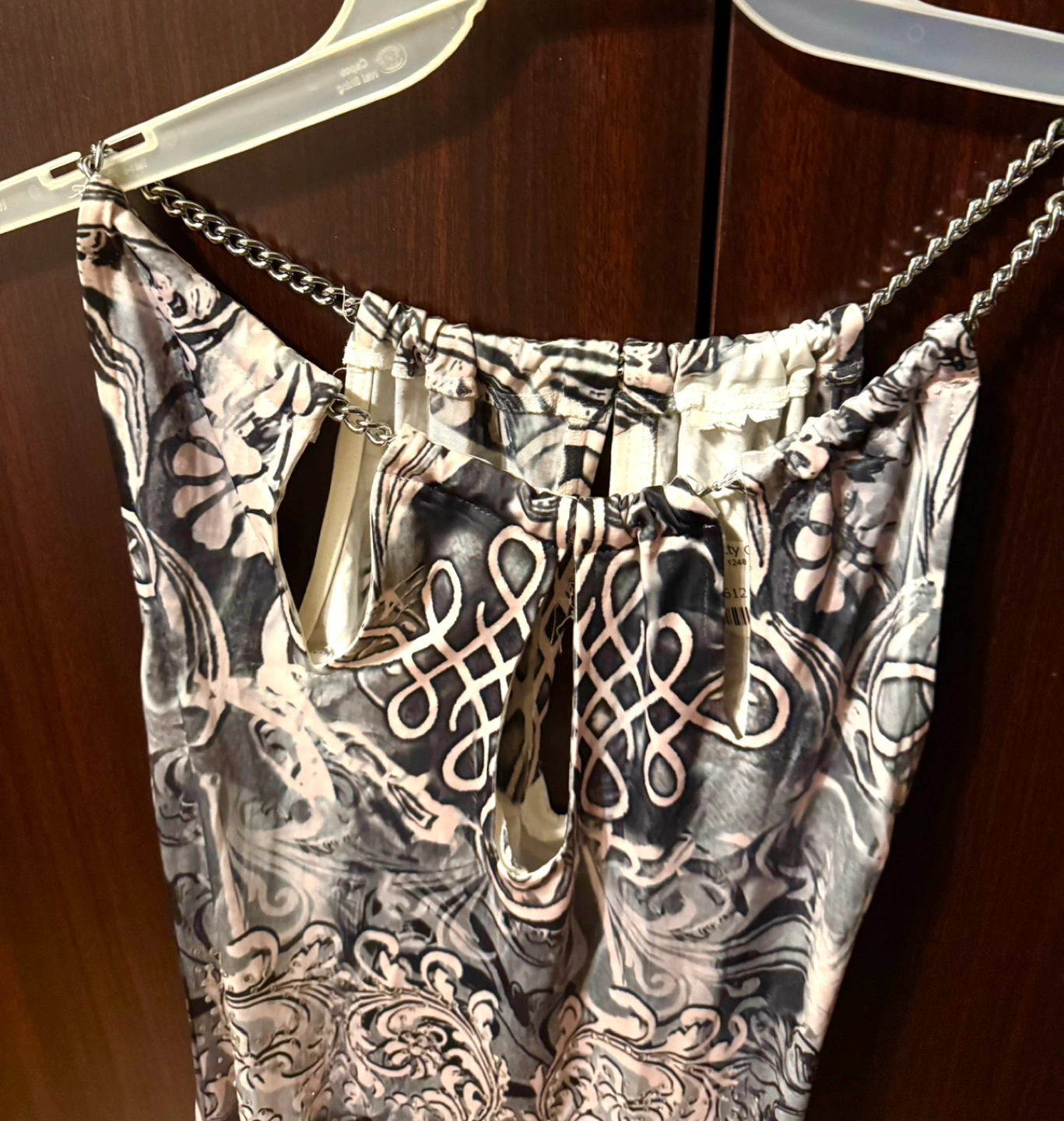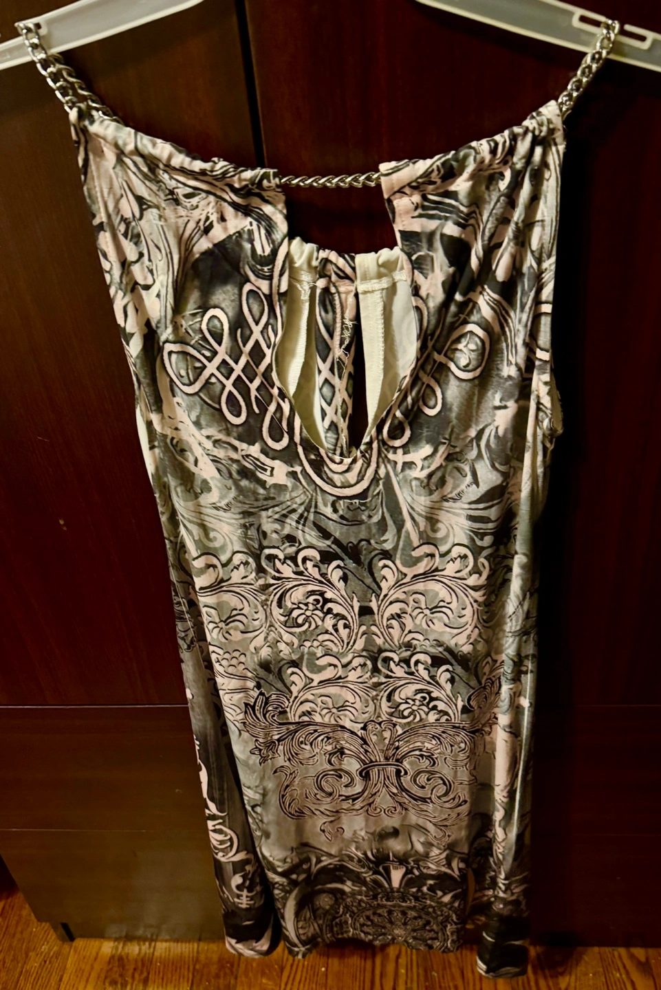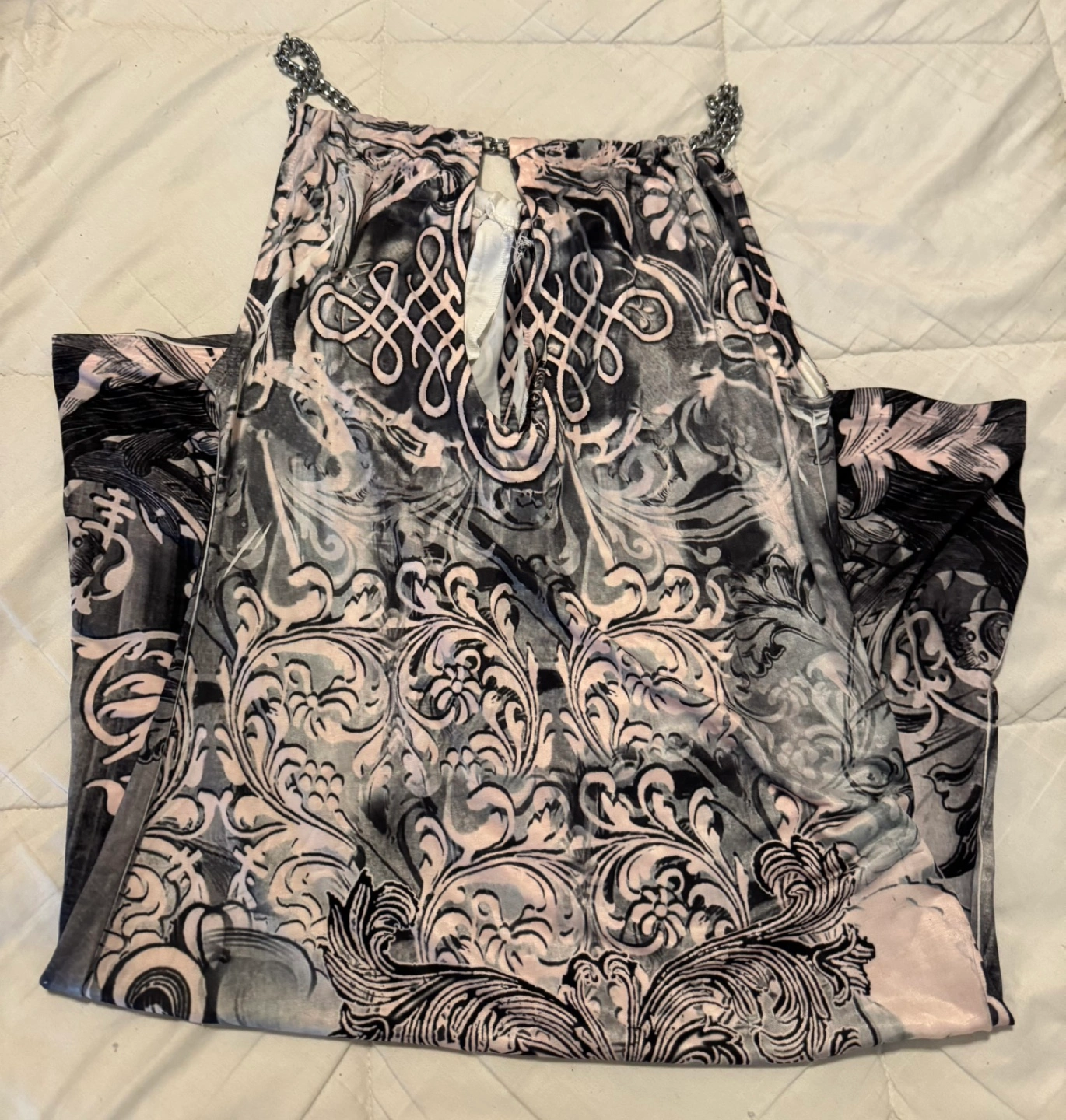 Stunning sleeveless dress. Features a beautiful black pink and white print, keyhole neckline, rhinestones,