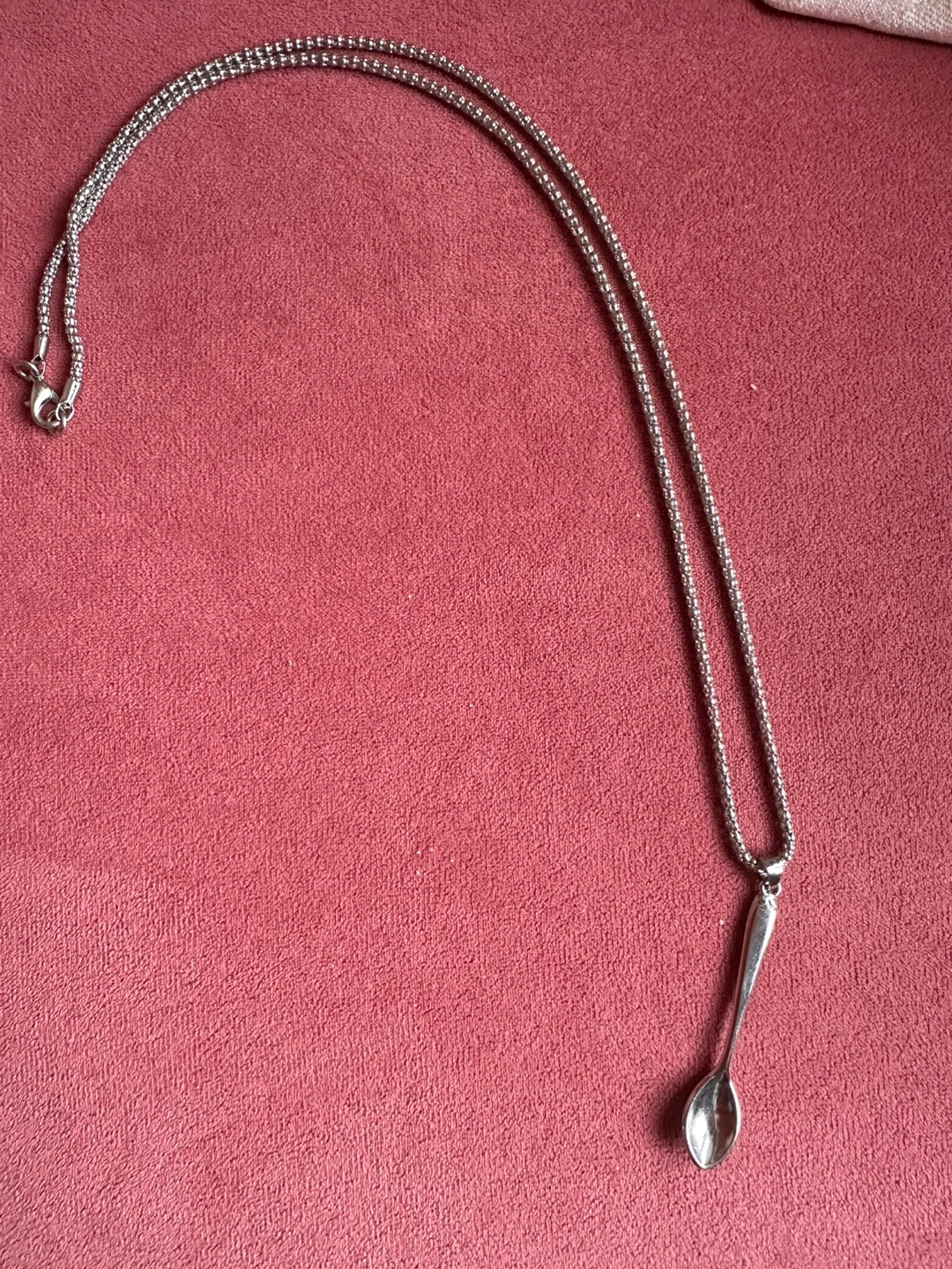 Unique necklace featuring a small spoon pendant. Silver chain. Great gift.