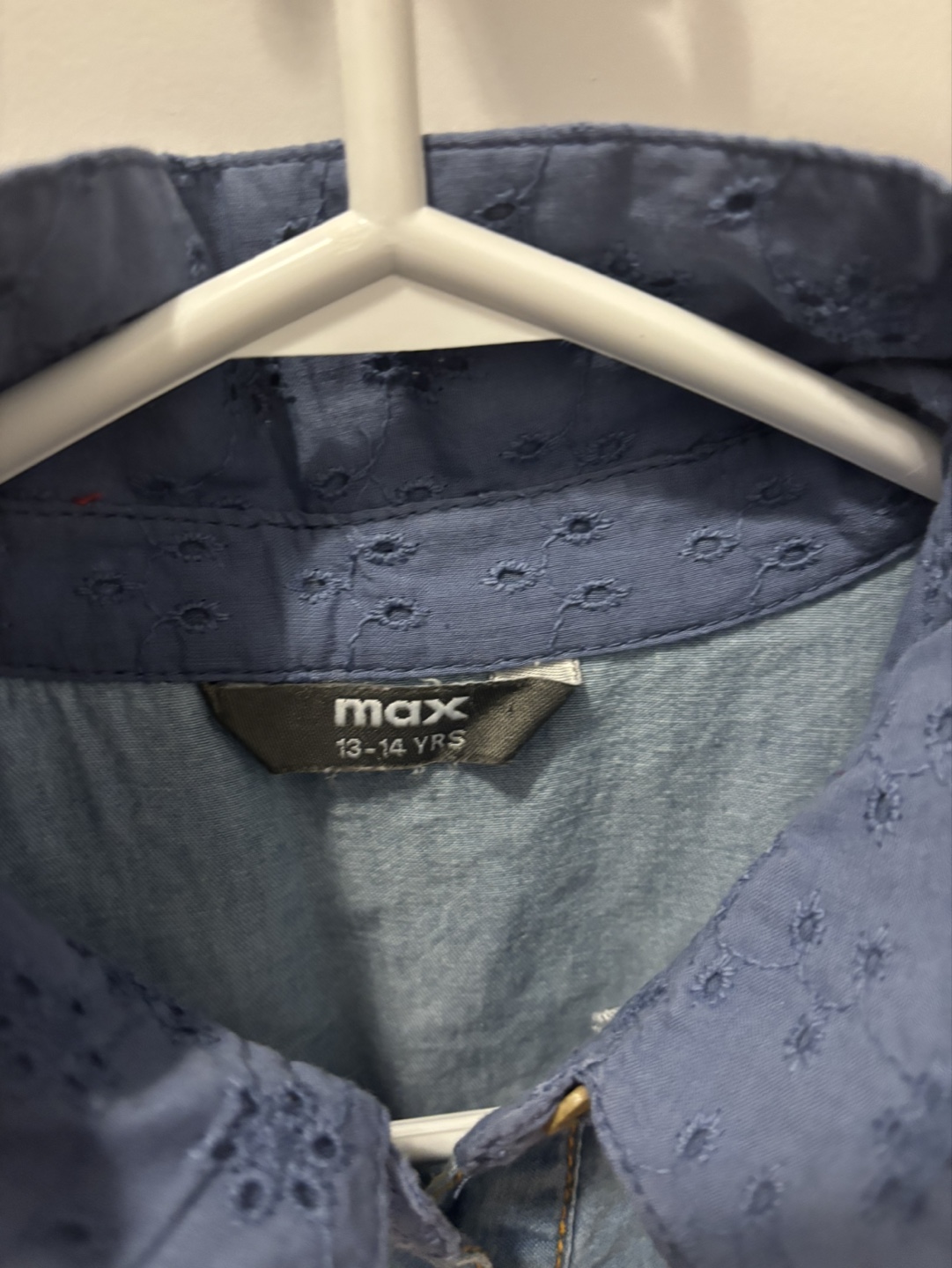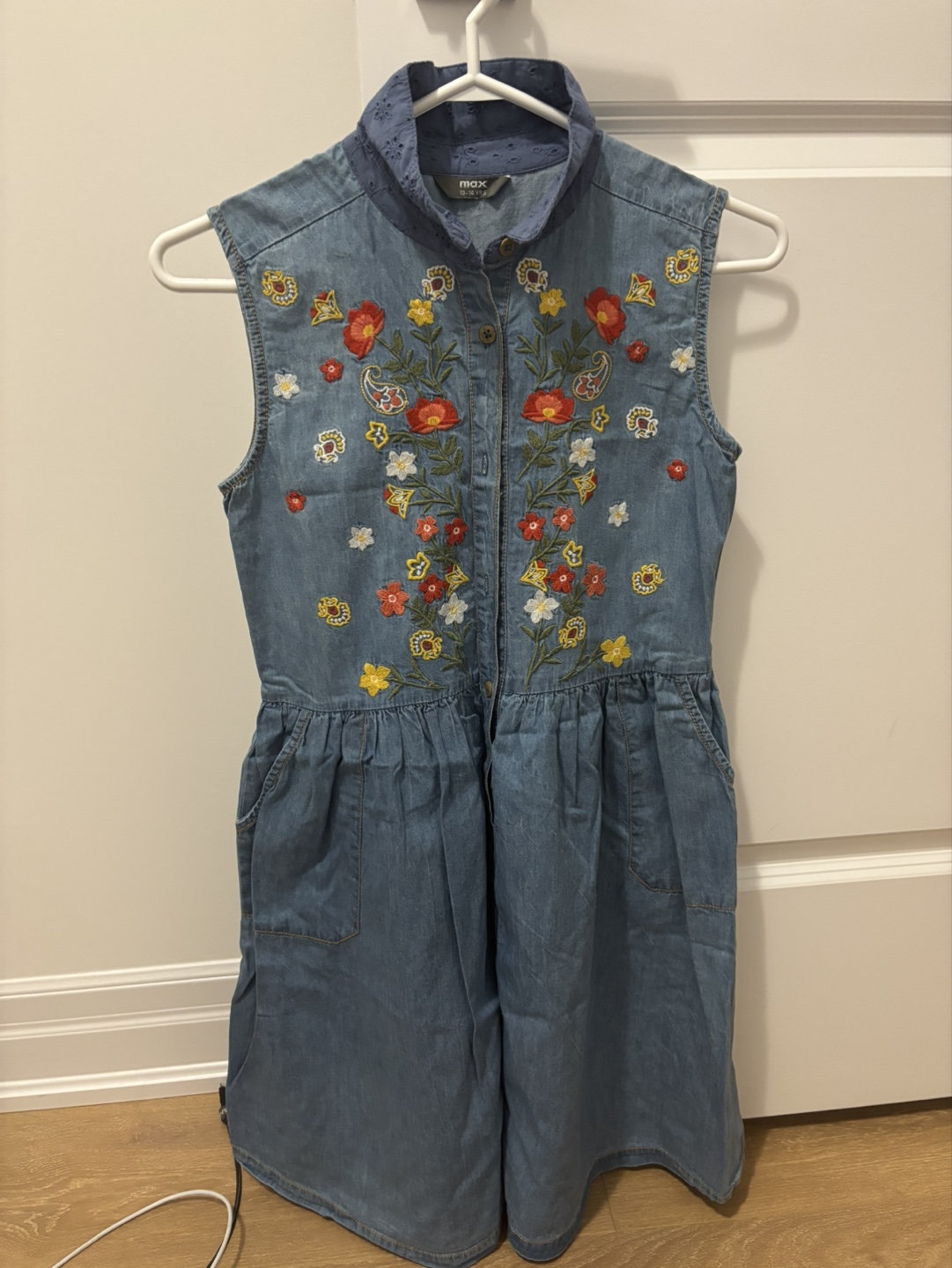 Cute sleeveless denim dress. Features colourful floral embroidery. Button-down closure. Two pockets. Size 13-14 years.