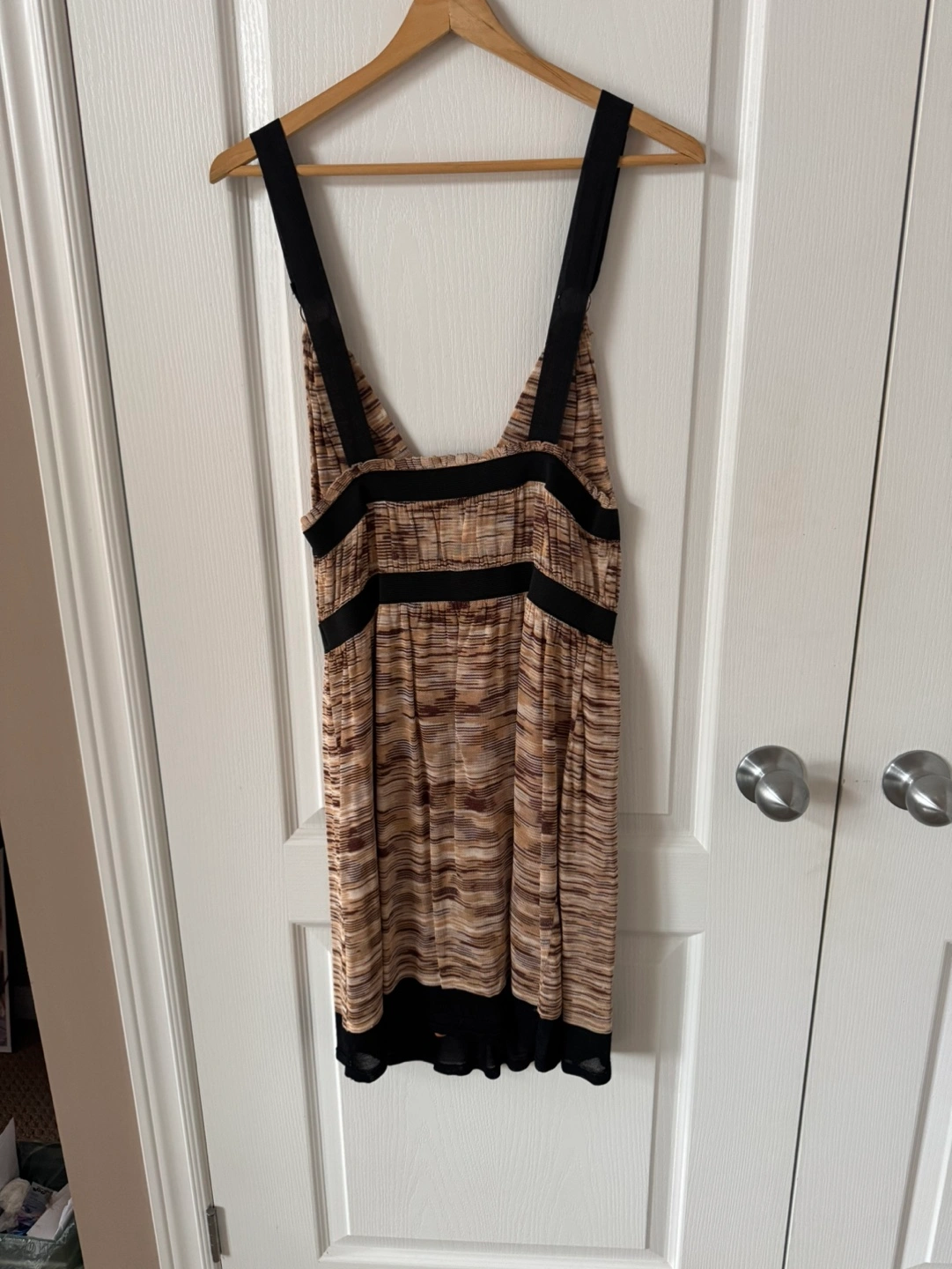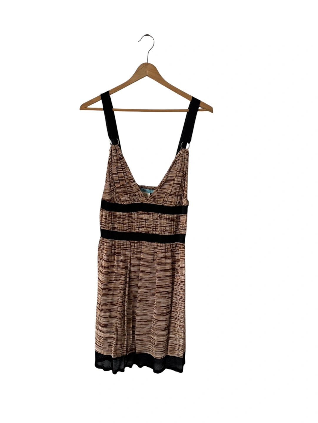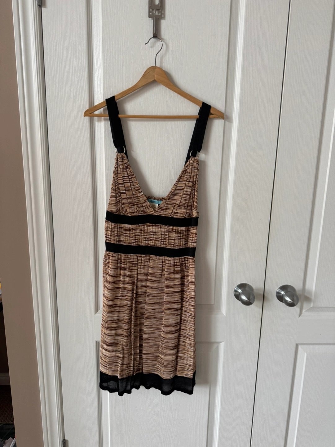 Beautiful sleeveless summer dress. Features a V-neckline, thin shoulder straps, and a striped pattern. Black accents around the bust and hem. Size small.