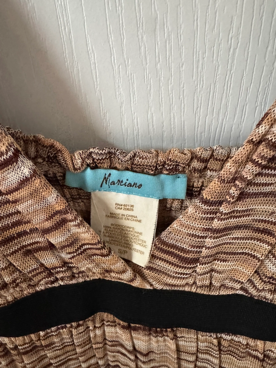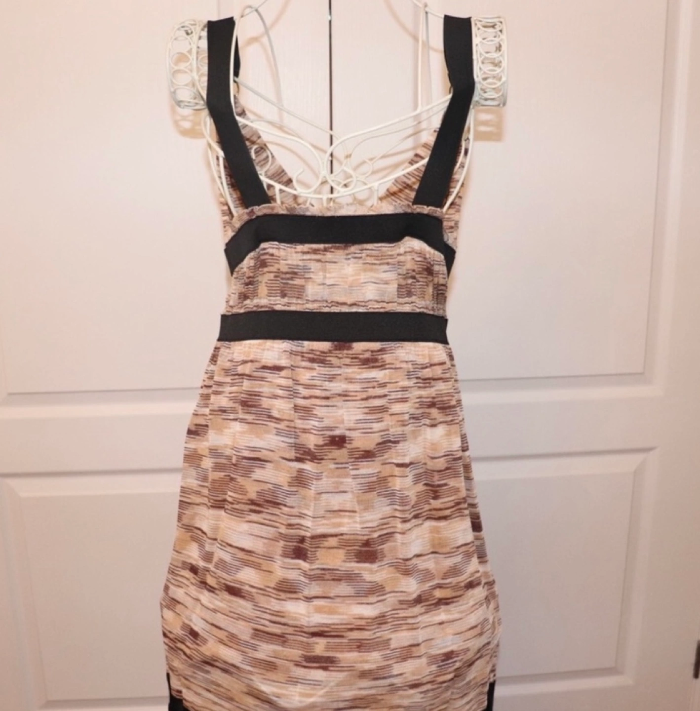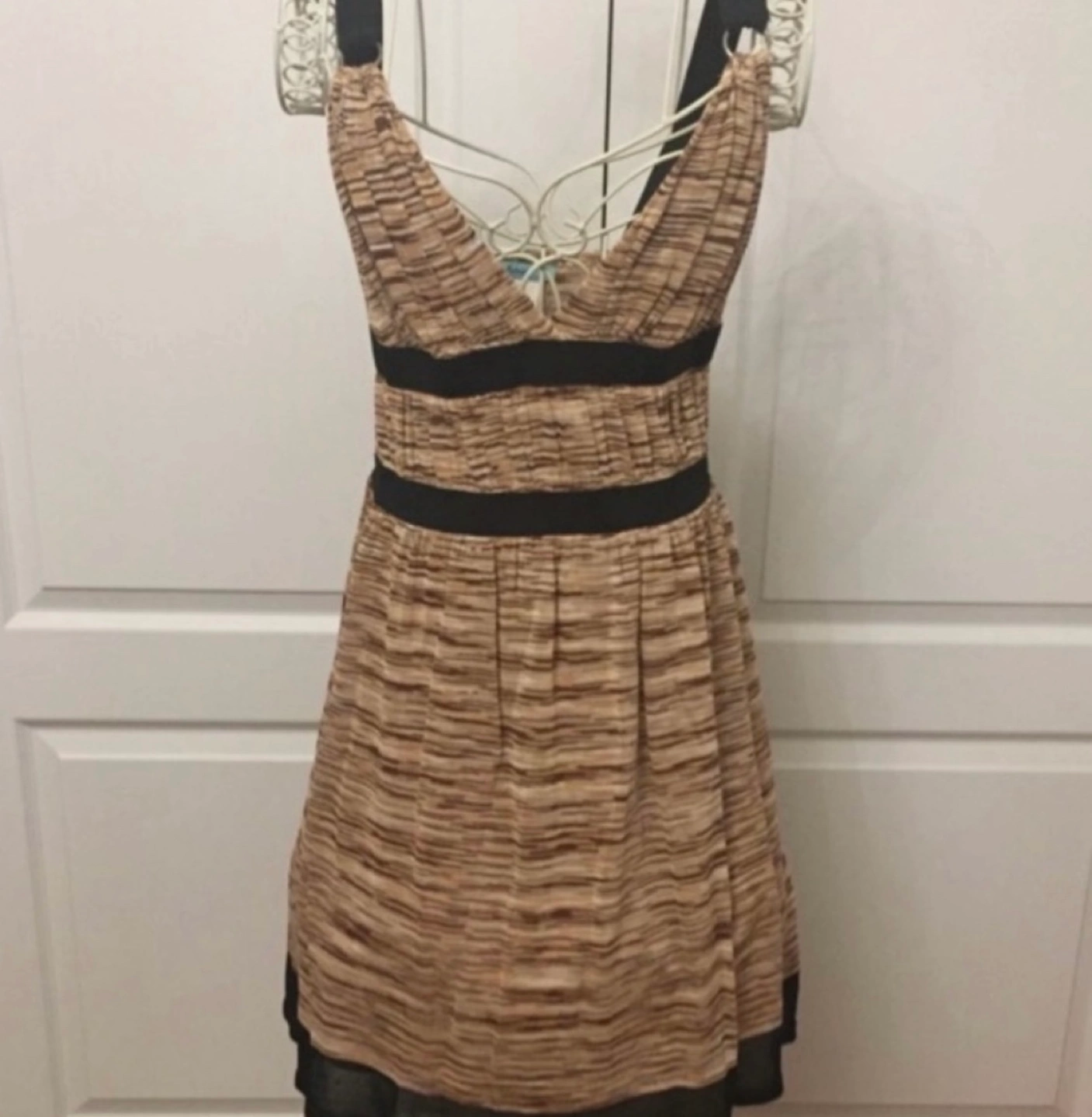 Beautiful sleeveless summer dress. Features a V-neckline, thin shoulder straps, and a striped pattern. Black accents around the bust and hem. Size small.