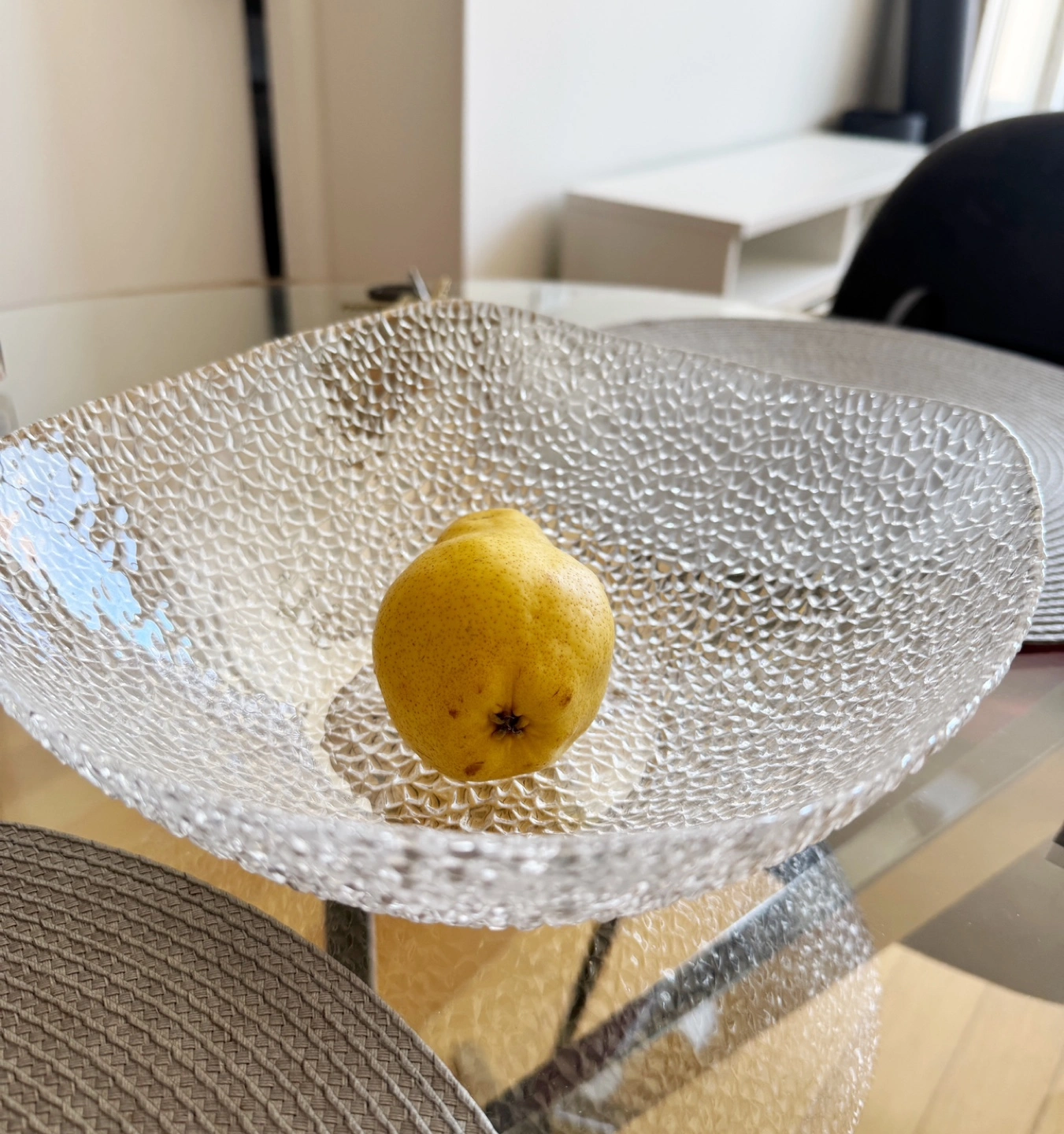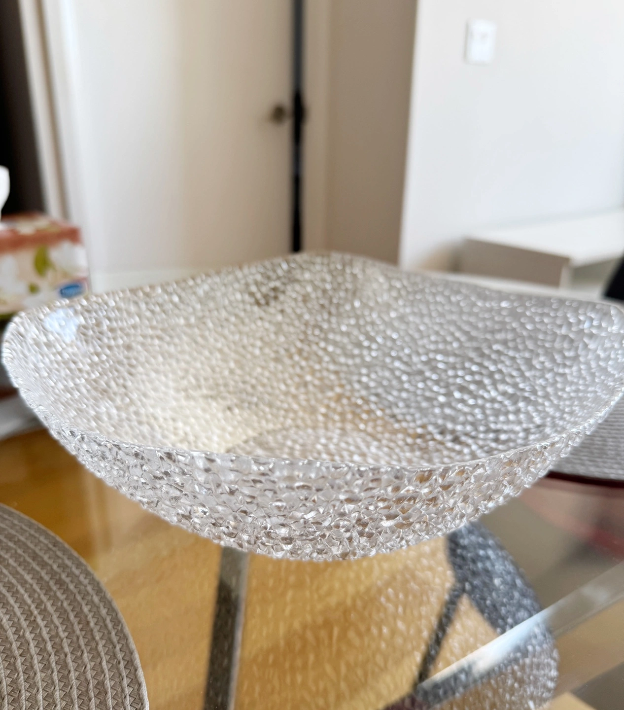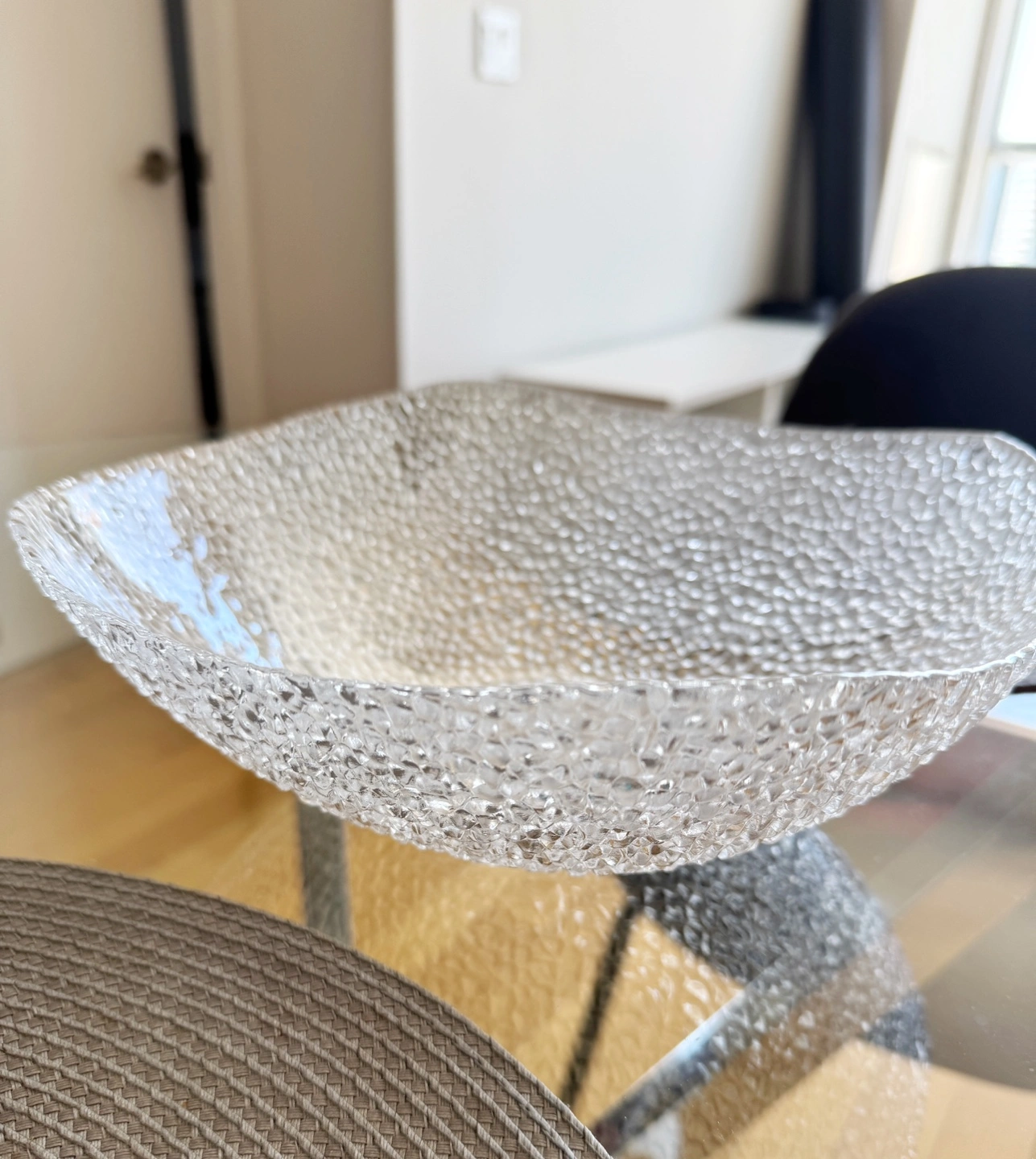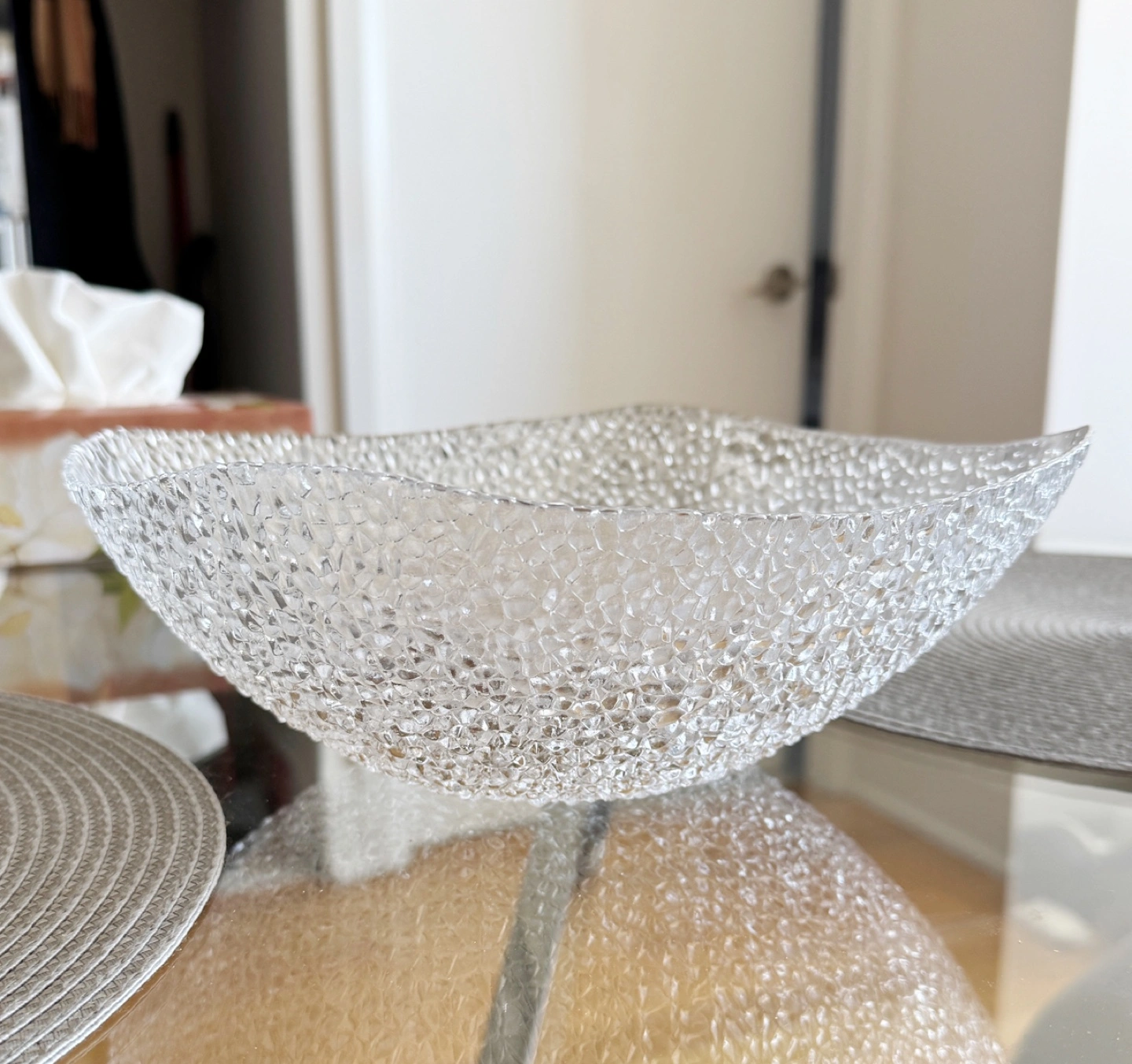 MOVING SALE Glass Fruit / Decorative Bowl Textured Glass Smooth on inside 10” wide Very elegant and beautiful In excellent, almost new condition, very clean Pick-up in last week of April (can put on hold for you) Pick-up near Sherbourne and Wellesley