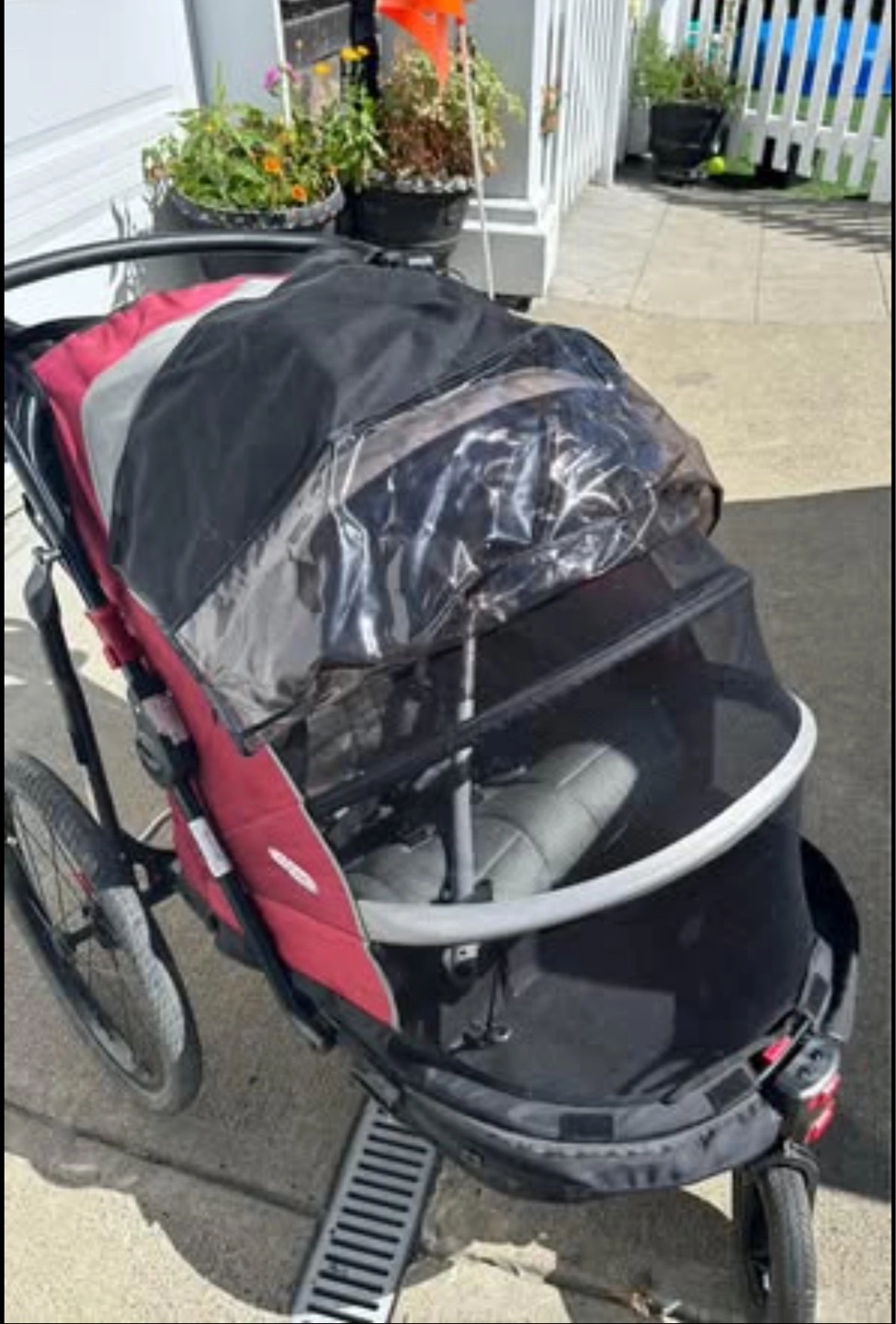 Adjustable 5-point harness with padded shoulder strap for safe, secure and comfortable ride with two-in-one bug screen and weather shield for extra protection for your litte passenger.