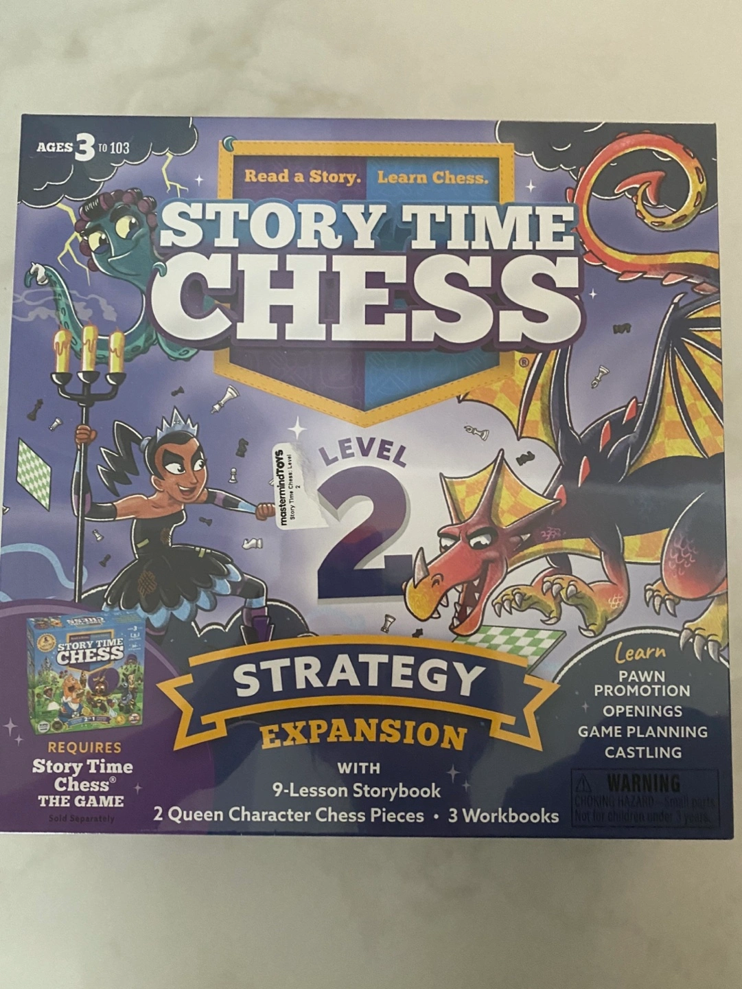 Learn chess with this Story Time Chess Level 2 expansion. Includes a 9-lesson storybook, 2 queen character chess pieces, and 3 workbooks. Requires Story Time Chess game. Level 2 teaches pawn promotion, openings, game planning, and castling.