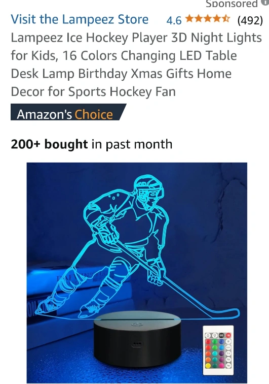 Buy & SellHockey Player LED Night LightHockey Player LED Night Light$8Acrylic hockey player night light. Colour changing LED. USB powered. Great for a child's room or hockey fan.ConditionNewWHERE TO MEETsurrey centralView MapSELLERcocoWhalley647 reviews0 chats·0 favorites·11 views