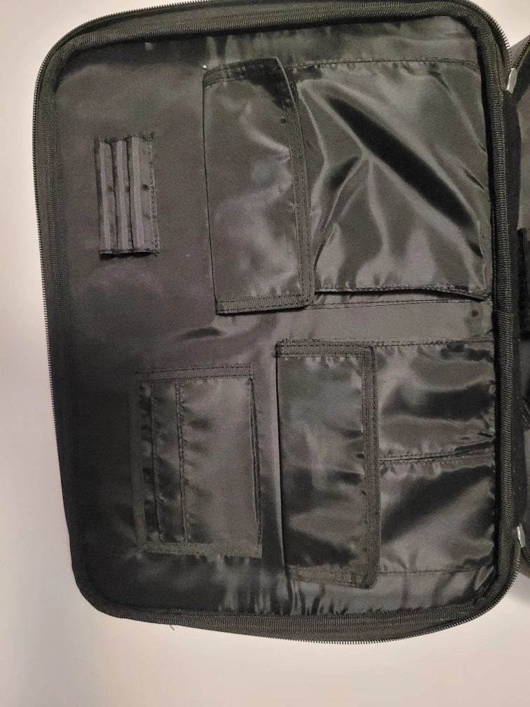 Black laptop carrying case. Features padded laptop compartment, multiple interior pockets, and an adjustable shoulder strap. Exterior pocket included. Great for carrying a laptop or tablet.