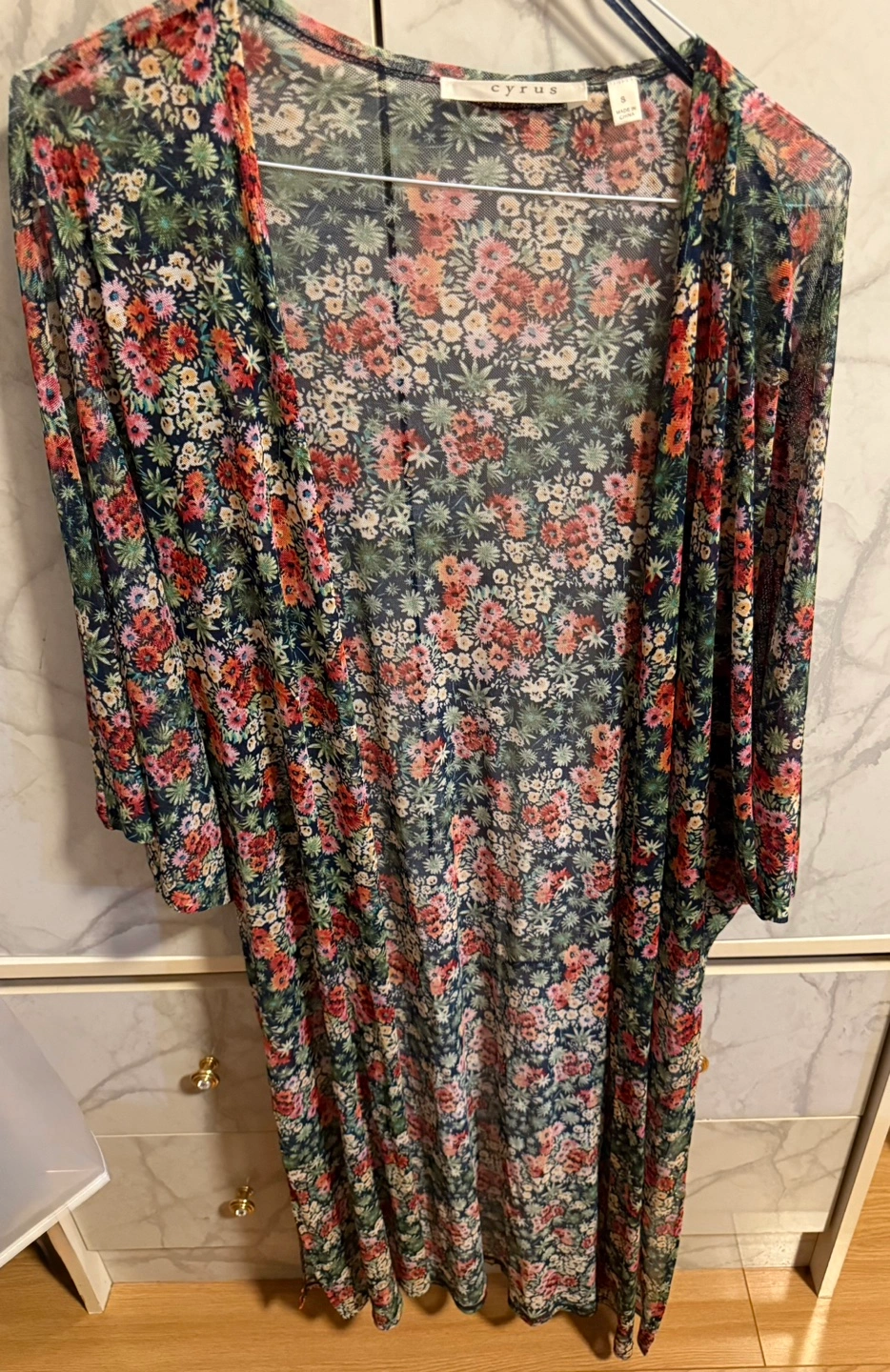 Beautiful floral print. Sheer mesh fabric. Open front. Three-quarter sleeves. Lightweight and fashionable. Perfect as a cover up or as an add on over an outfit. Never worn. Brand new but no tags. Oversized small. Feel free to combine with items from my other listings for a better price deal.