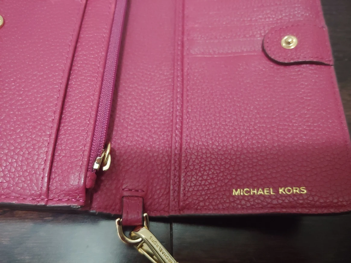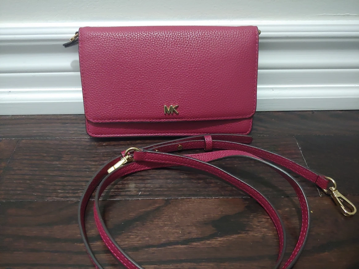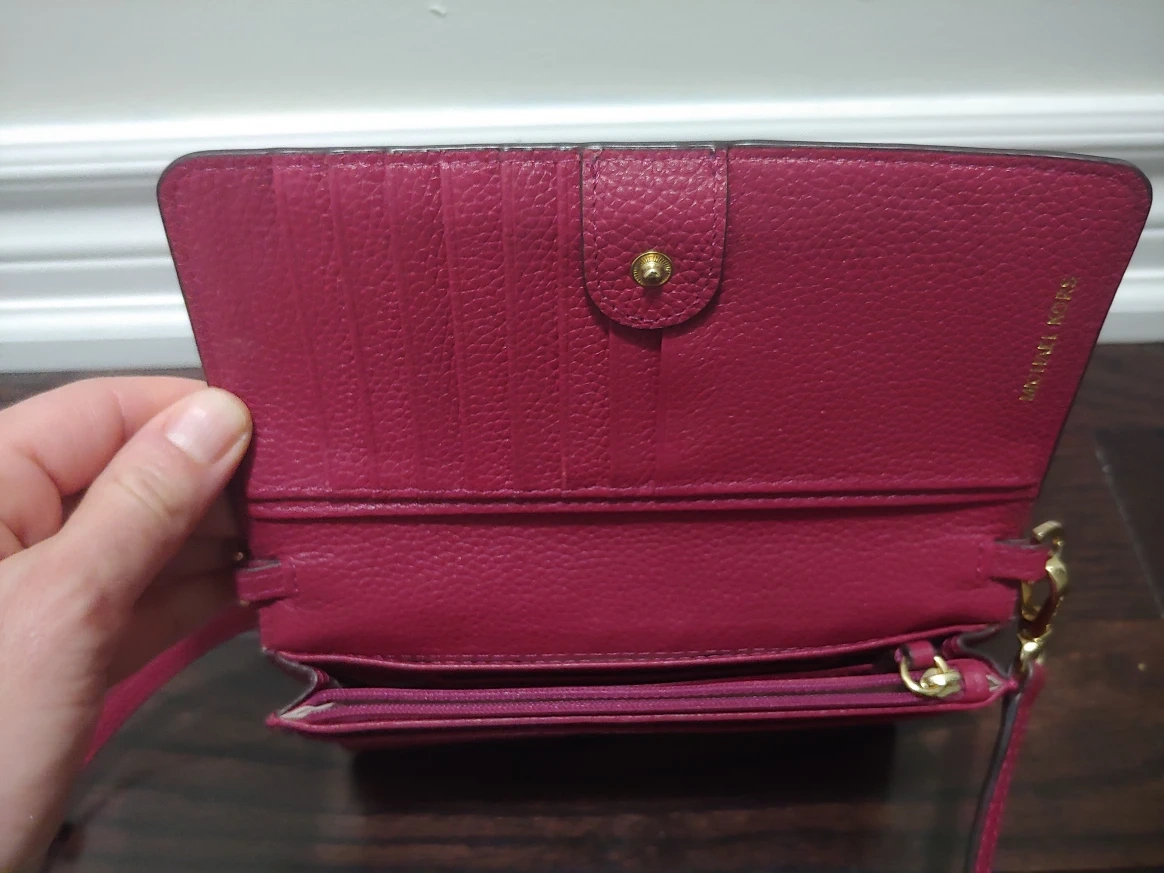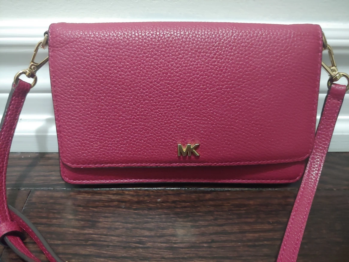 Pink Michael Kors leather crossbody wallet. Features multiple card slots and a zippered compartment. Adjustable and removable strap. this is in good condition.