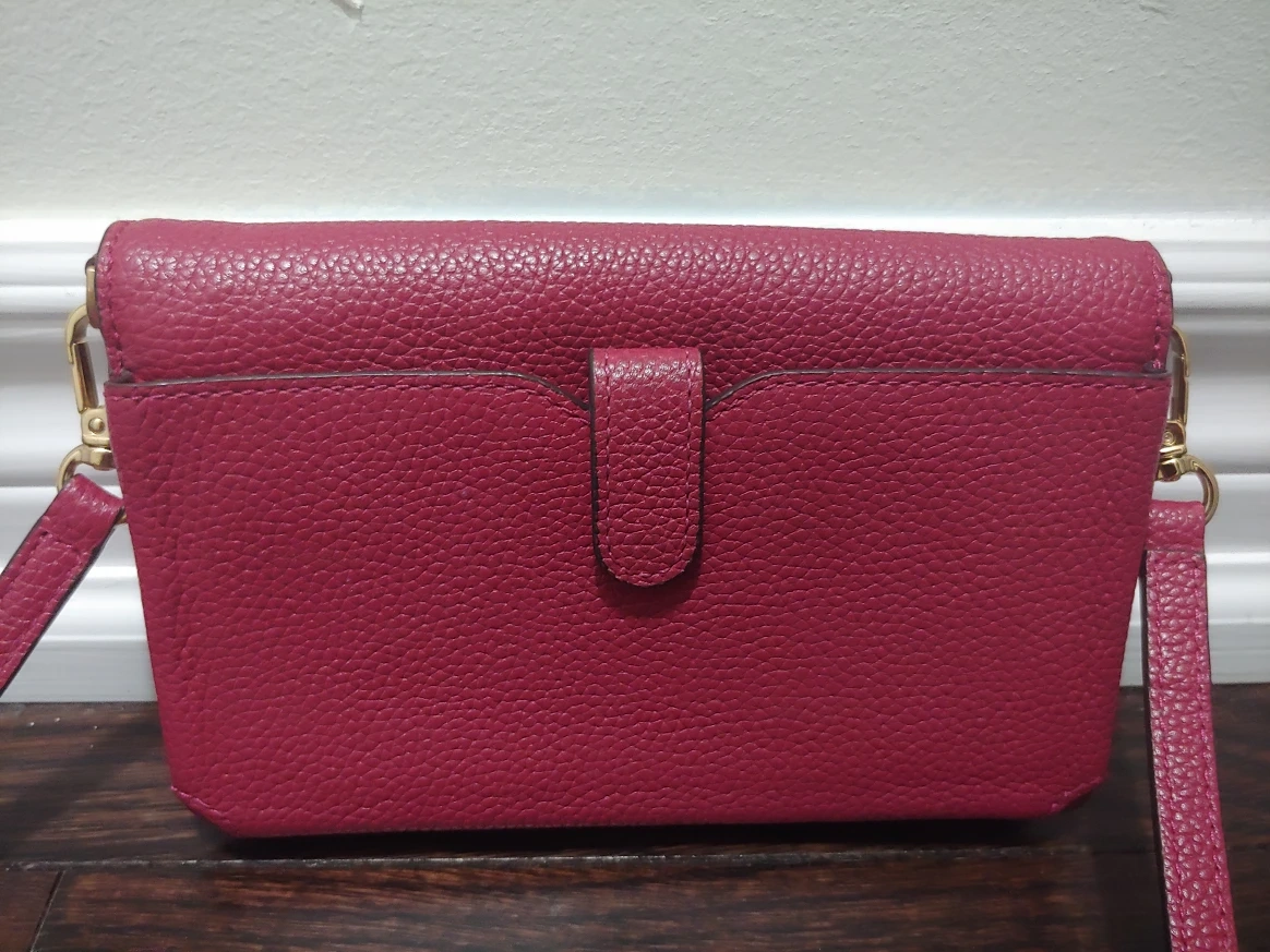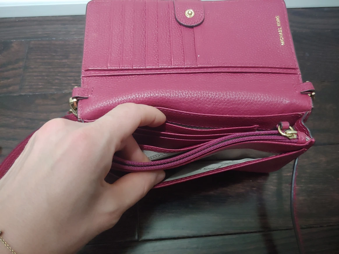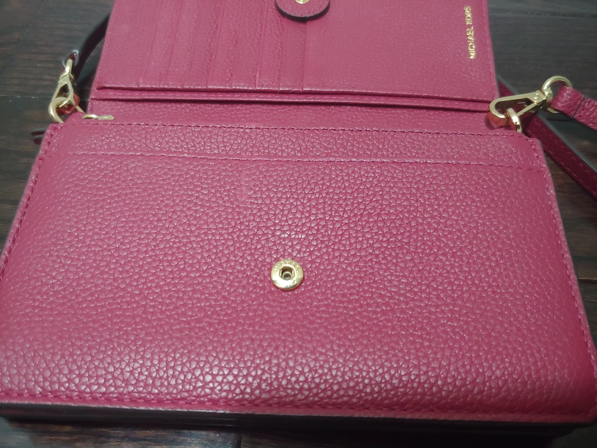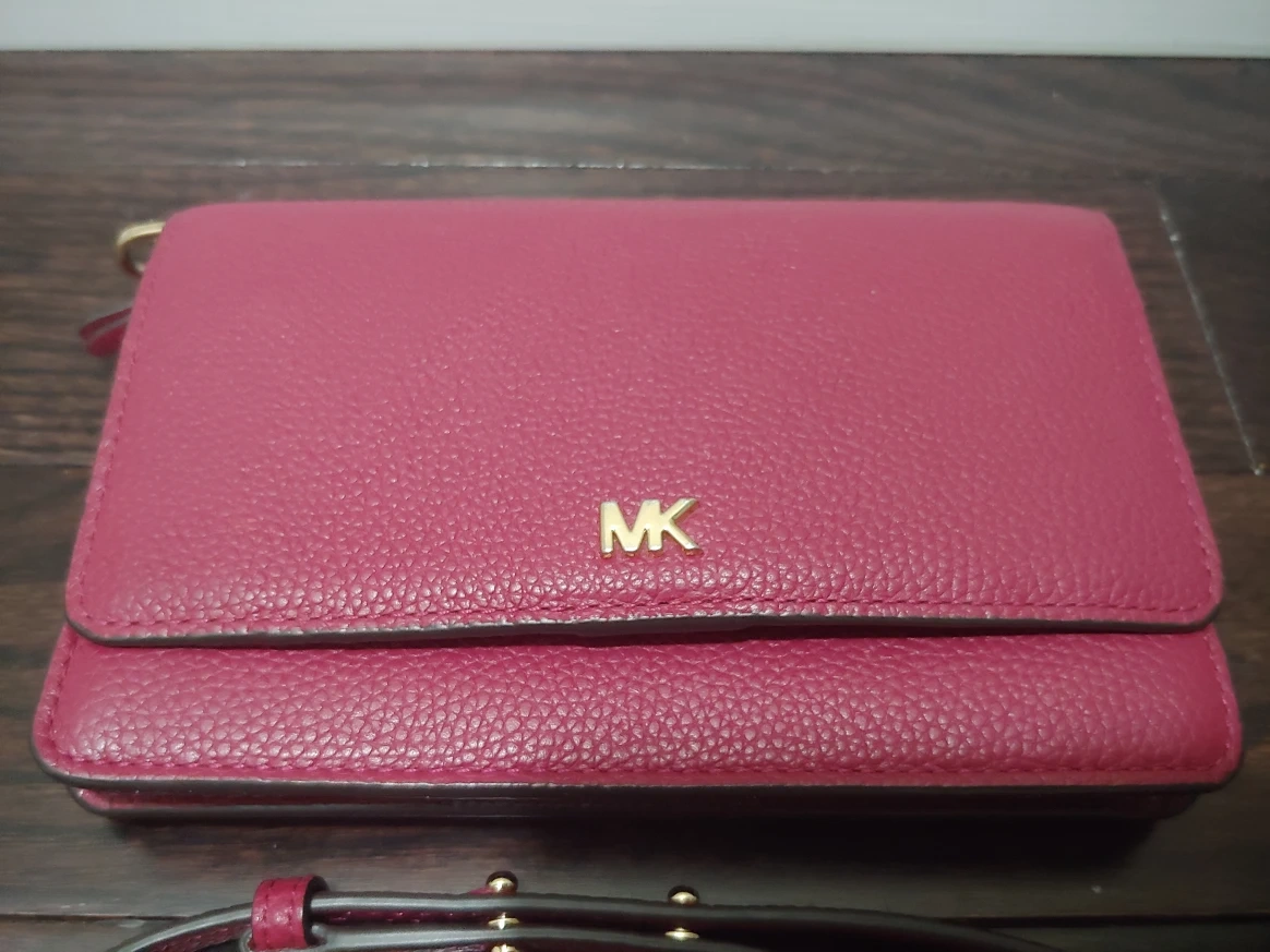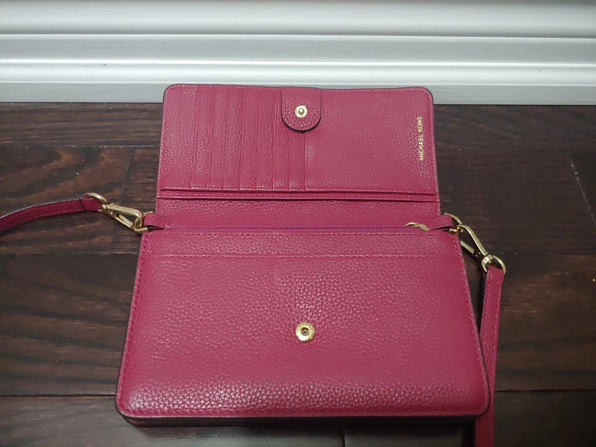 Pink Michael Kors leather crossbody wallet. Features multiple card slots and a zippered compartment. Adjustable and removable strap. this is in good condition.