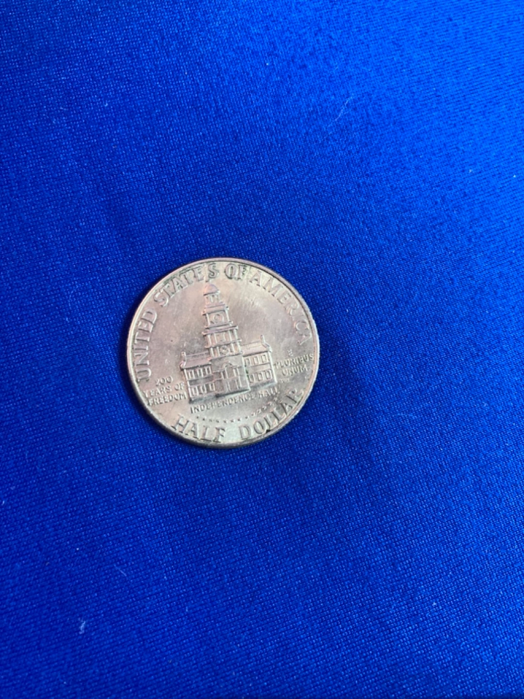 United States Bicentennial half dollar coin. Features John F. Kennedy on one side and Independence Hall on the other. Commemorates the 200th anniversary of the United States Declaration of Independence.