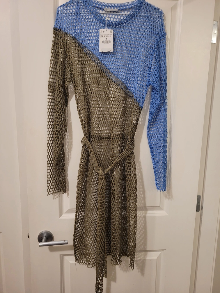 Zara Women's Size Medium Blue and Olive Green Mesh Mini Dress