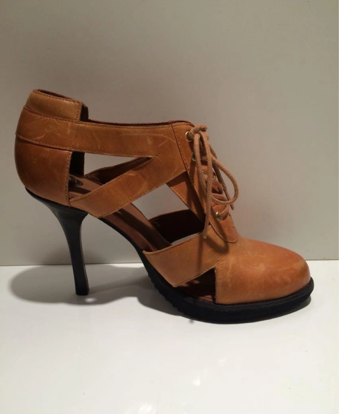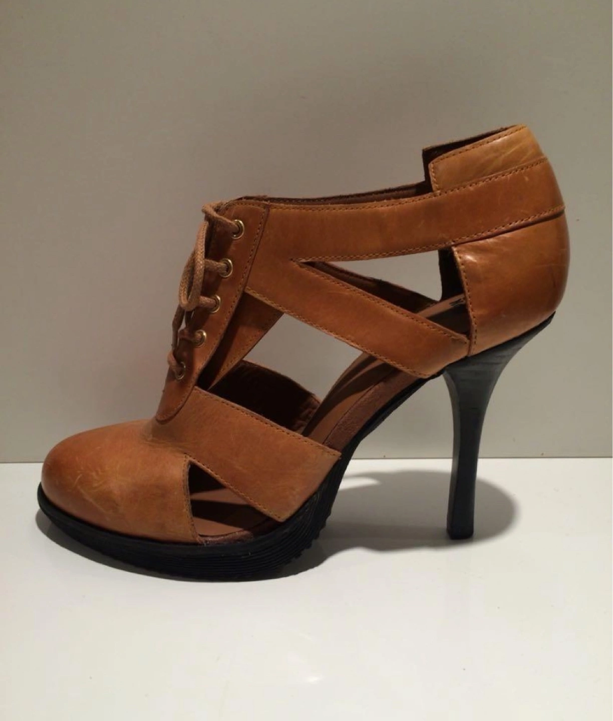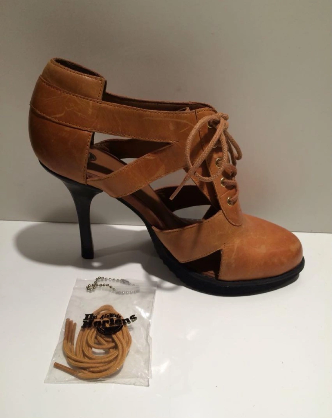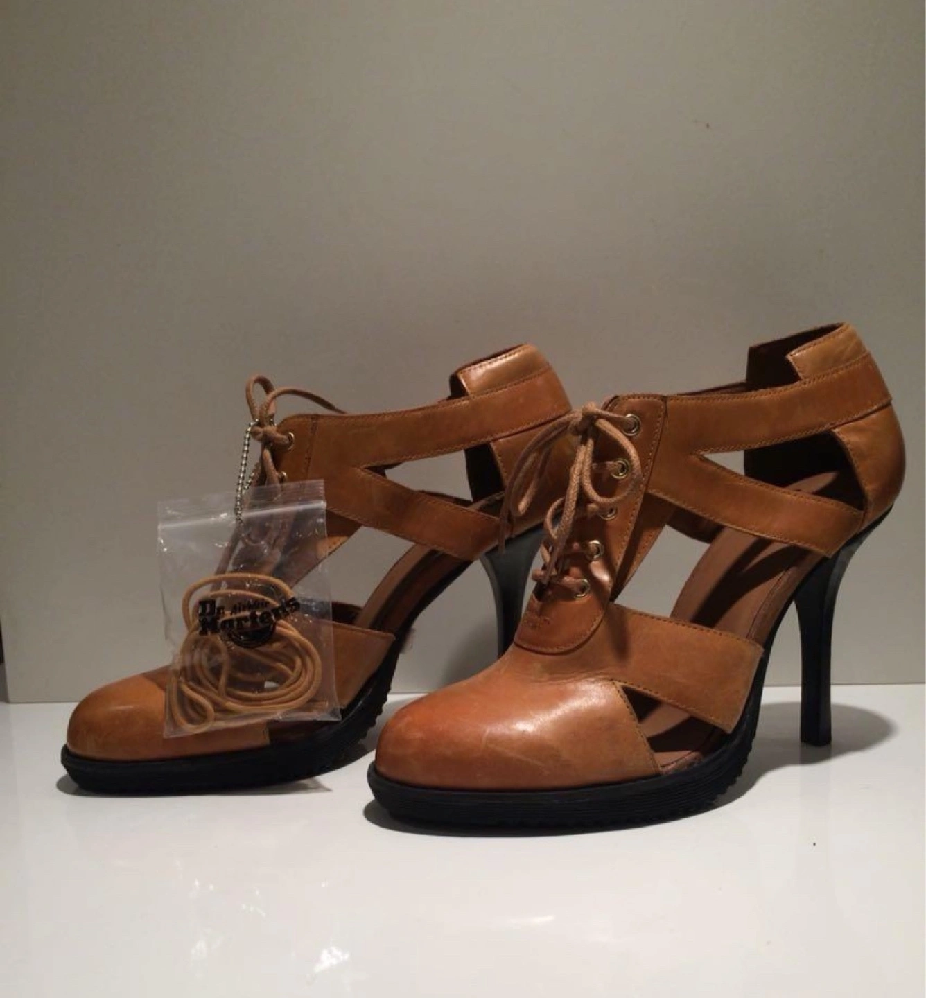 168Dr. Martens Tan leather high heels. Zita Jojo. Size 9. Cut-out design. Lace-up detail. Stiletto heel. Includes extra laces. Pick up at Eglinton Ave east at Bayview.
