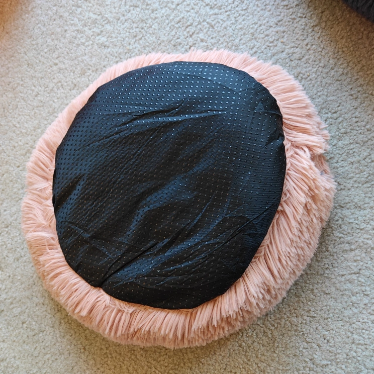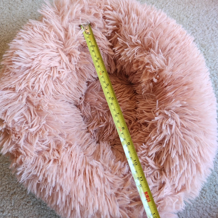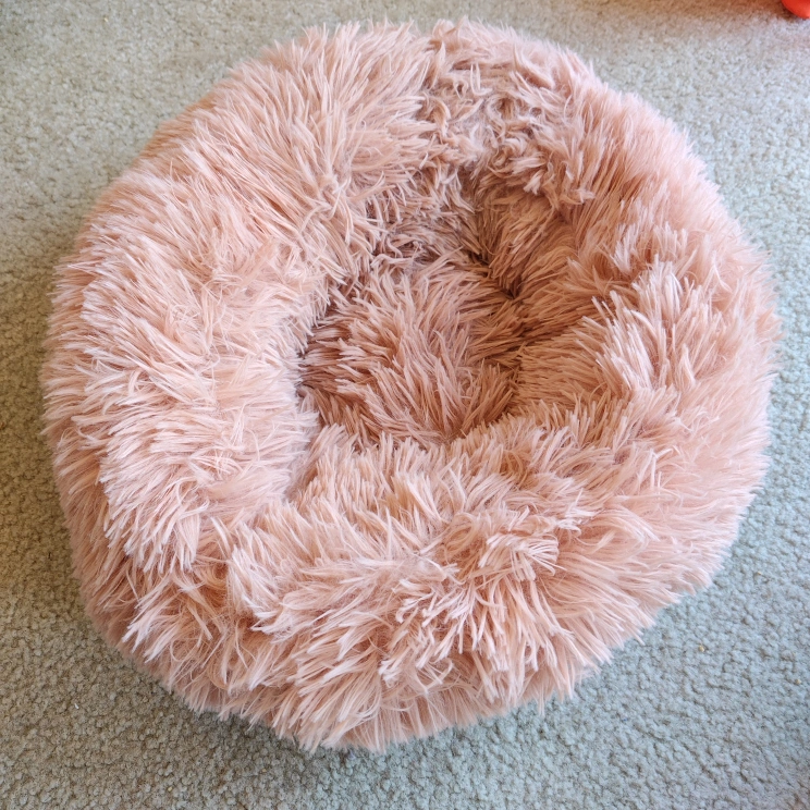 Adorable blush pink pet bed. Soft, fluffy material. Non-slip bottom. Perfect for small to medium-sized pets. Measures approximately 20 inches in diameter.