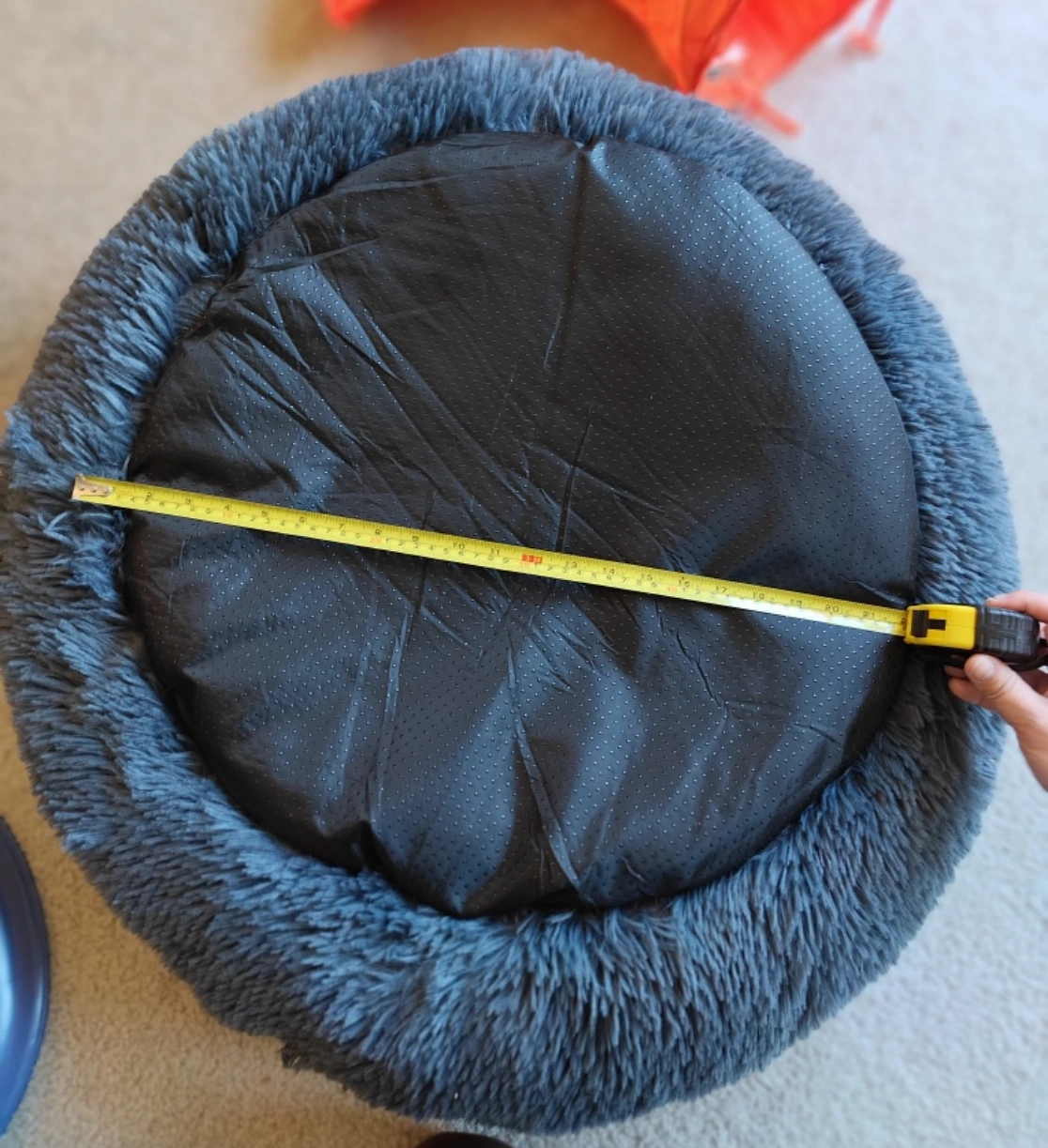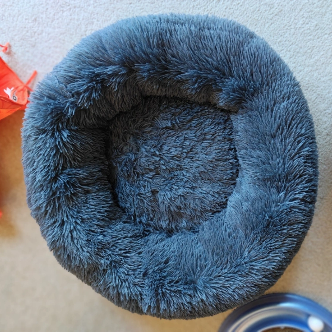 Cozy round dog bed. Soft grey fluffy material. Measures approximately 50cm in diameter. Waterproof bottom. Never used but kept in home with a cat.