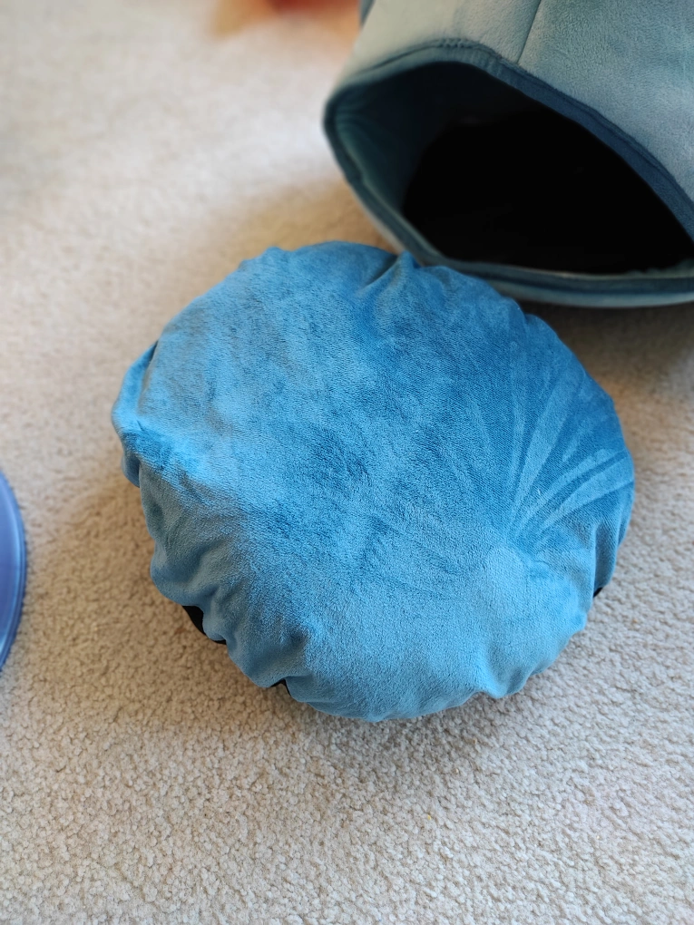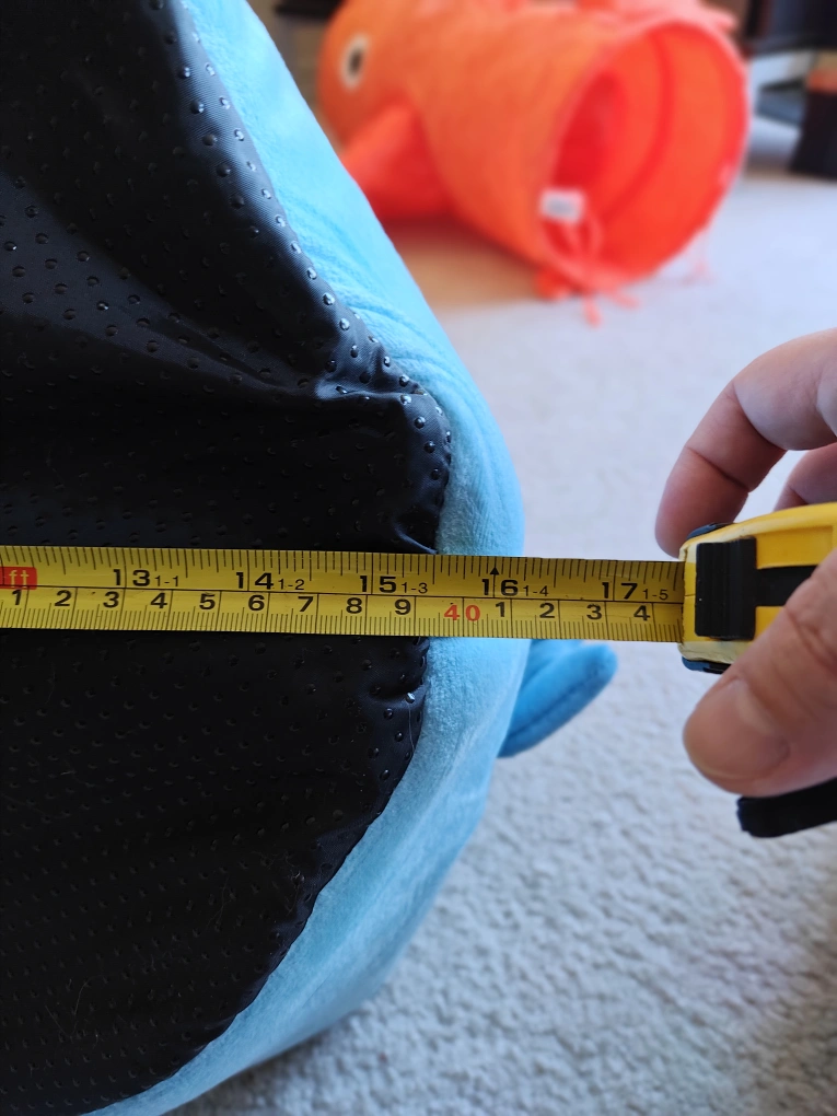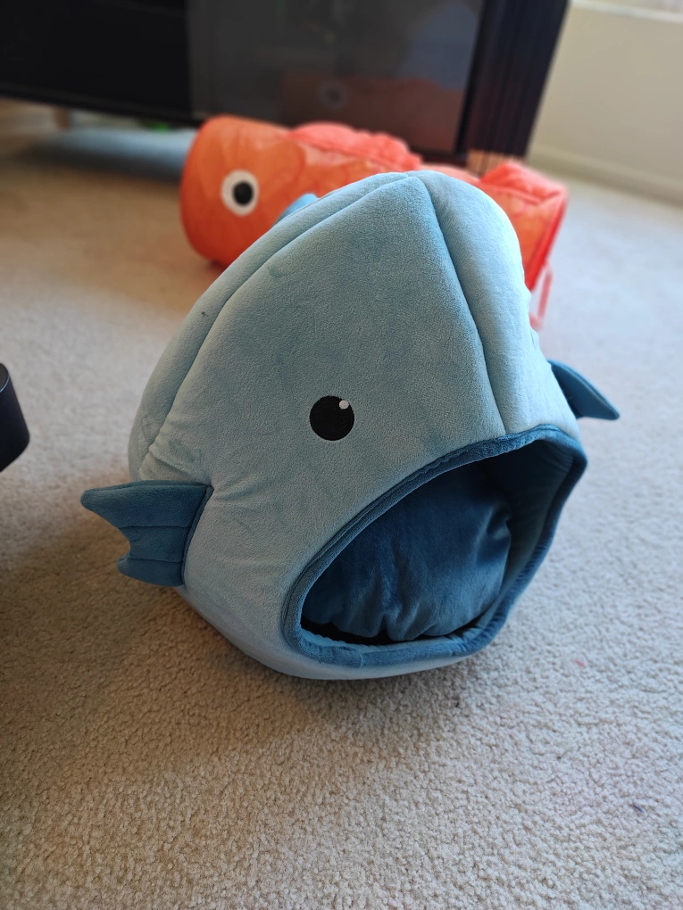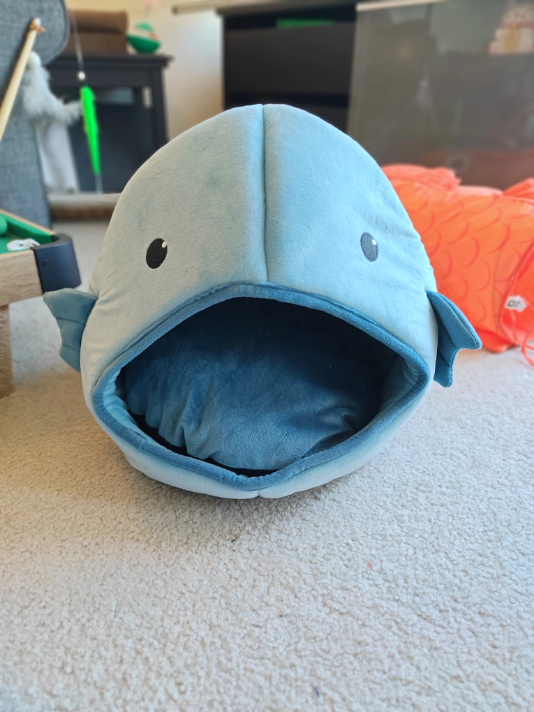 Adorable whale-shaped pet bed. Soft, plush material. Removable cushion. Measures approximately 17 inches long and 10 inches wide.