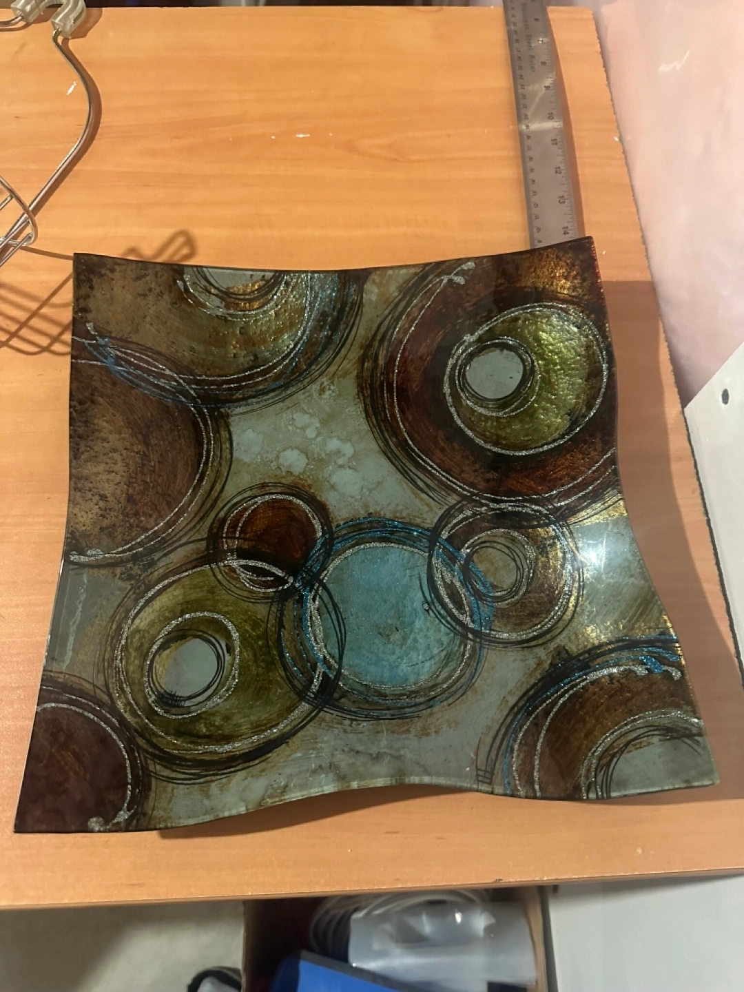 Stylish glass tray. Features an abstract design with swirling circles in shades of brown, green, and blue. Slightly wavy edges. Perfect for serving or displaying decorative items.