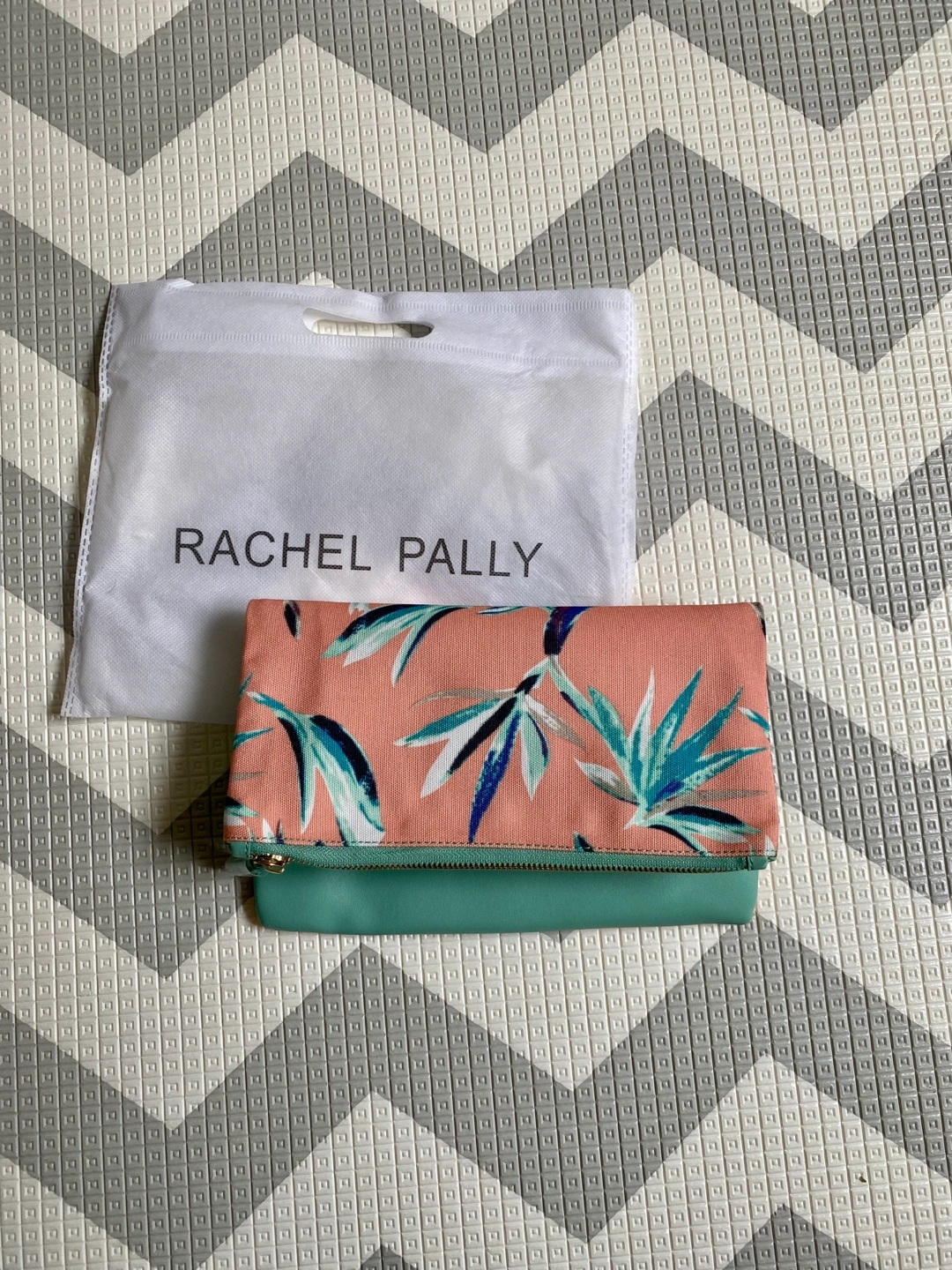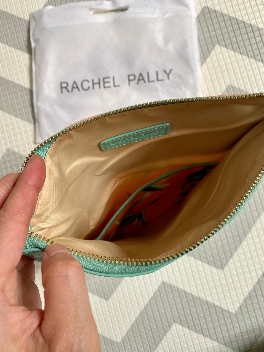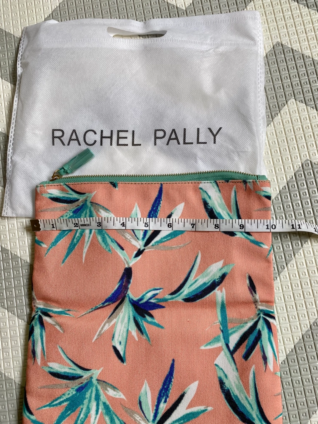Beautiful Rachel Pally clutch. Features a peach floral print and mint green leatherette bottom. Zipper closure. Includes dust bag.