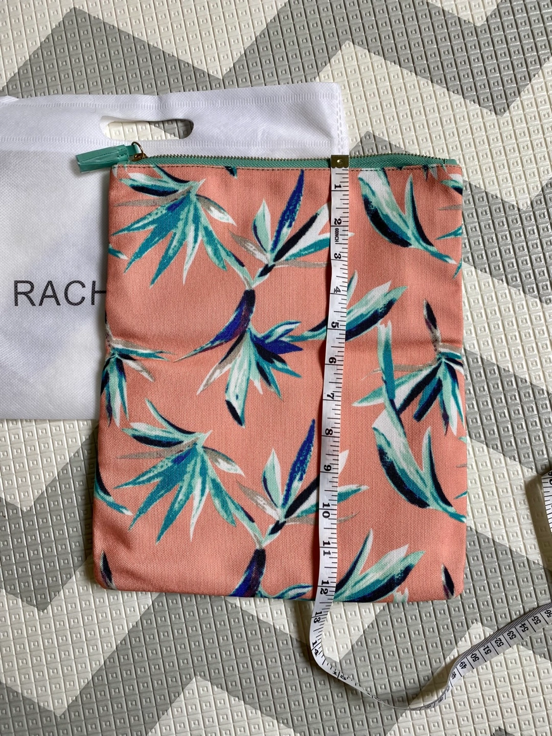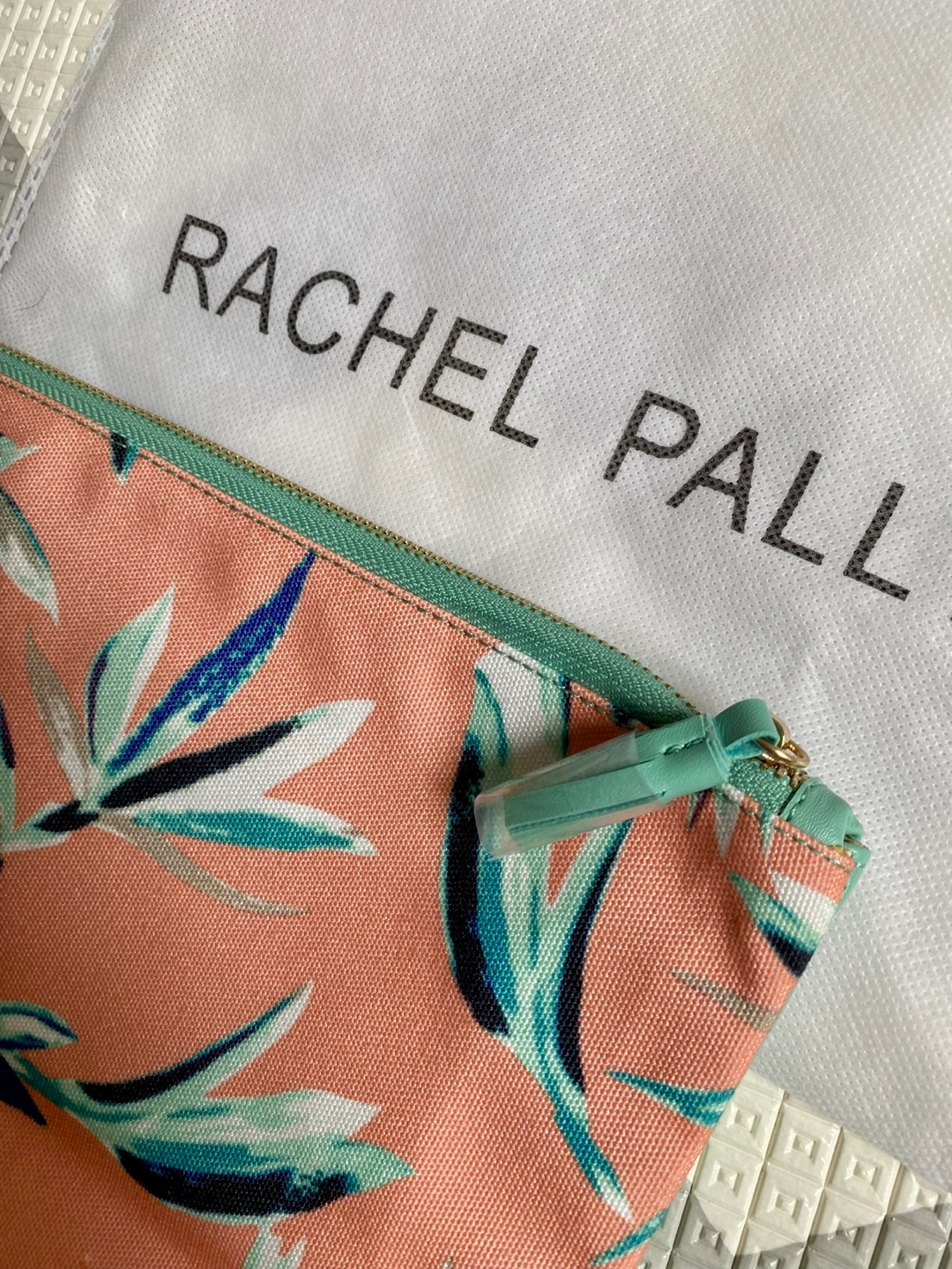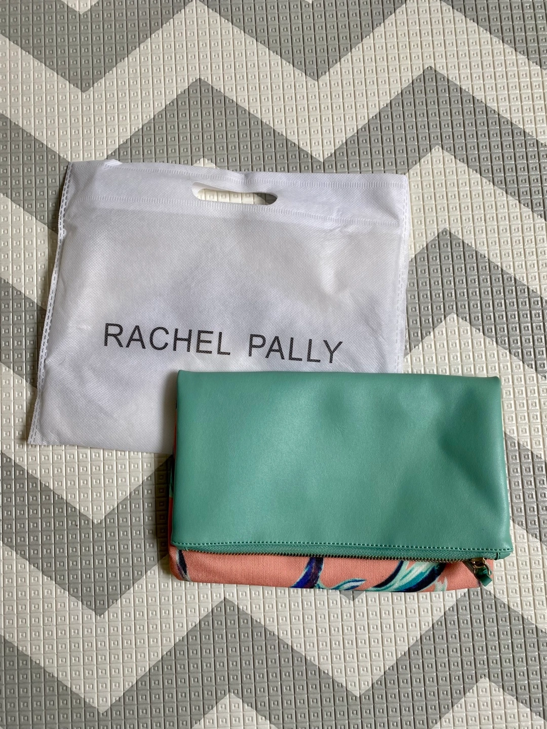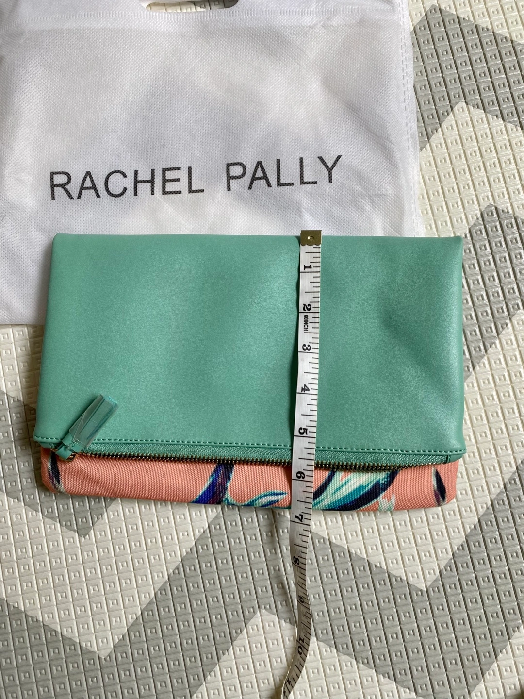 Beautiful Rachel Pally clutch. Features a peach floral print and mint green leatherette bottom. Zipper closure. Includes dust bag.