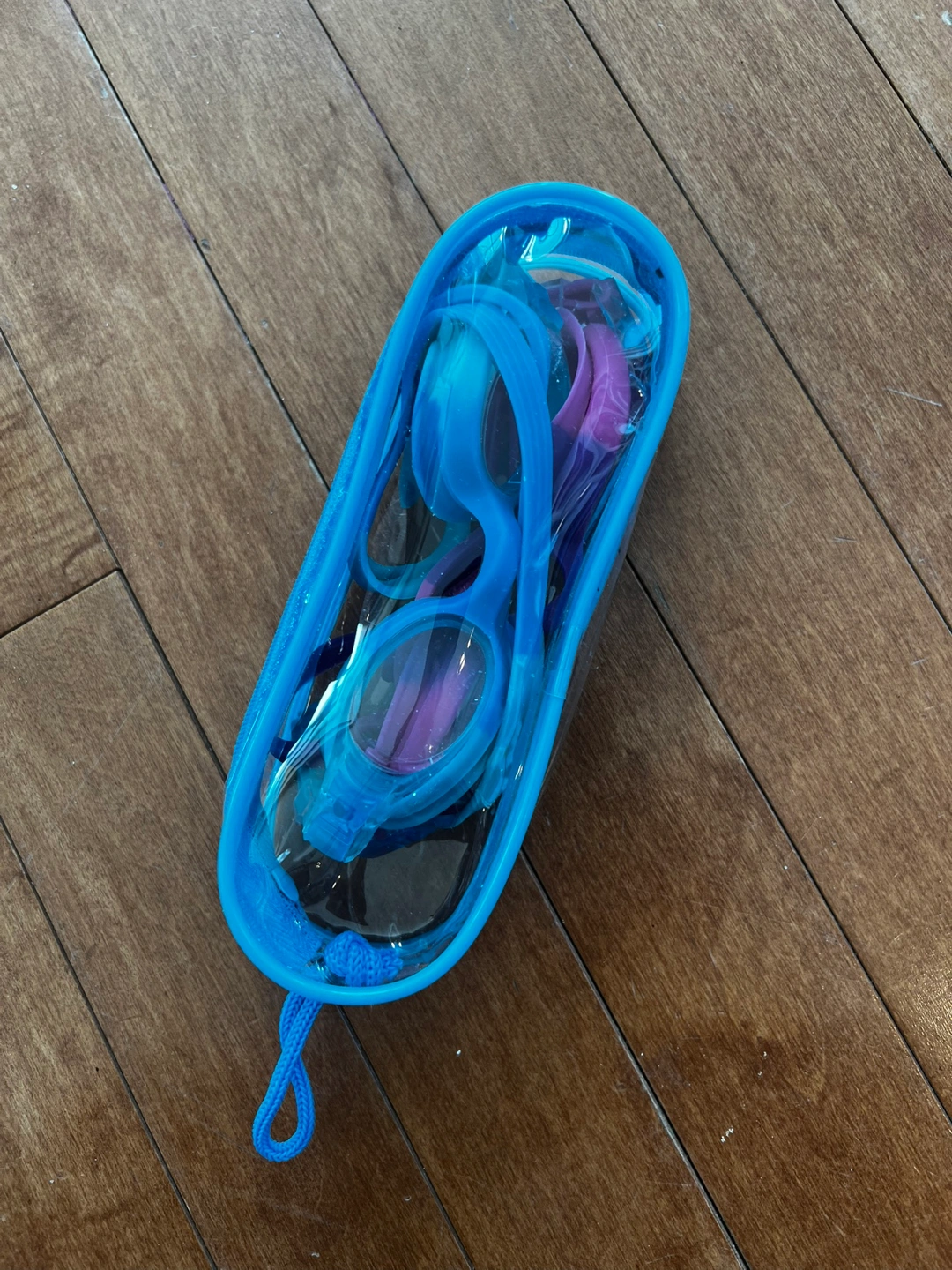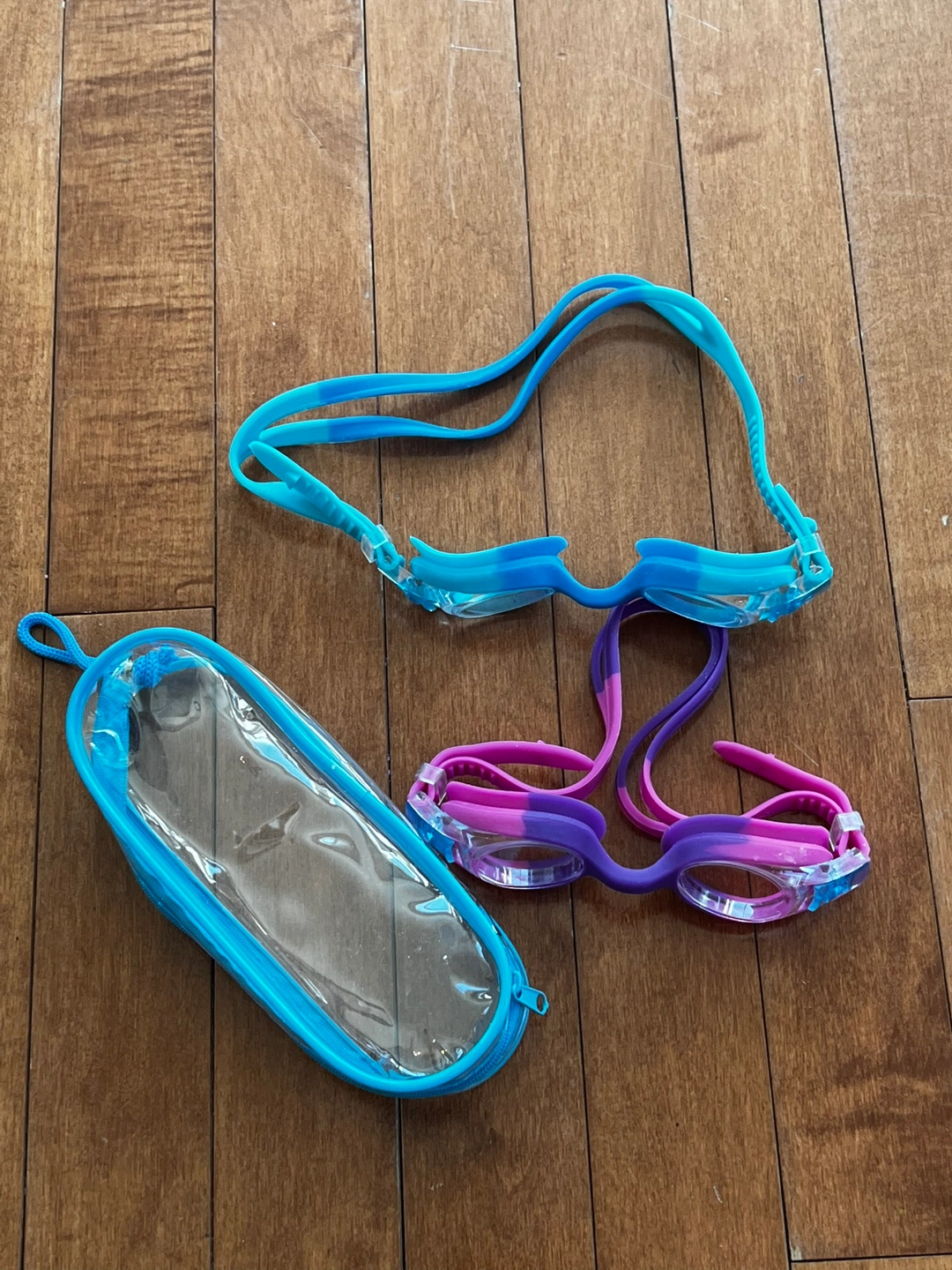 Two pairs of kids' swimming goggles. Includes a clear plastic carrying case. Pick up only.