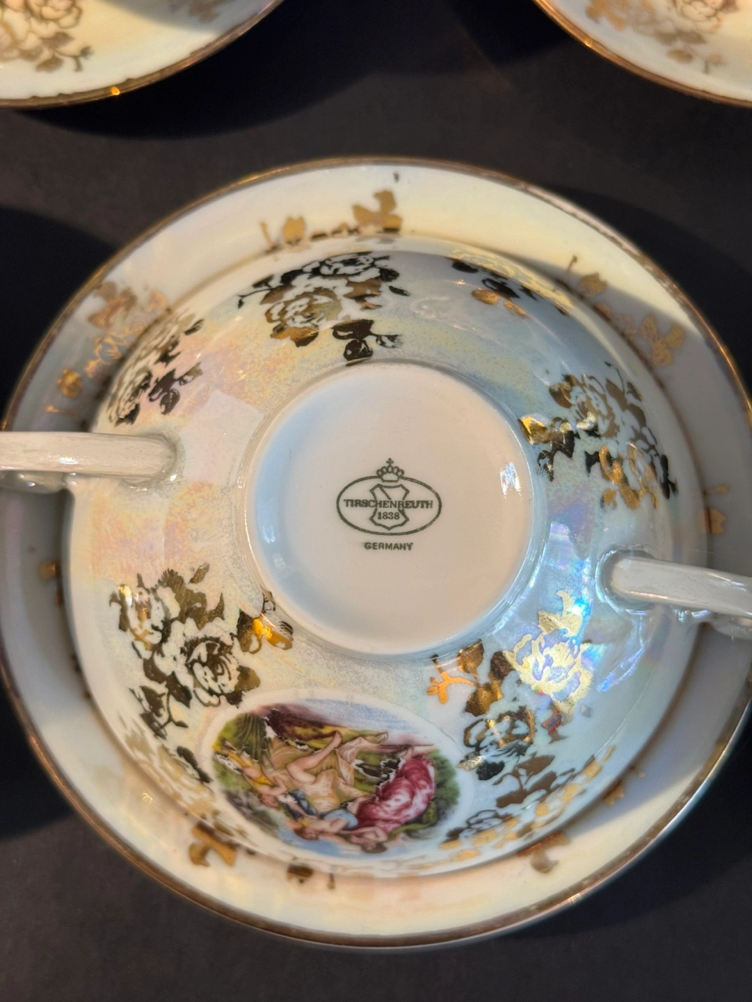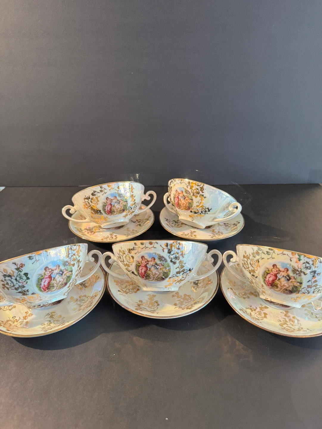 Set of five vintage porcelain soup bowls and saucers. Features ornate gold detailing and pastoral scenes. Made in Germany.