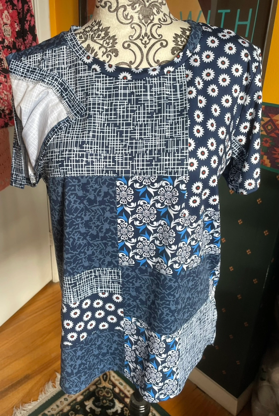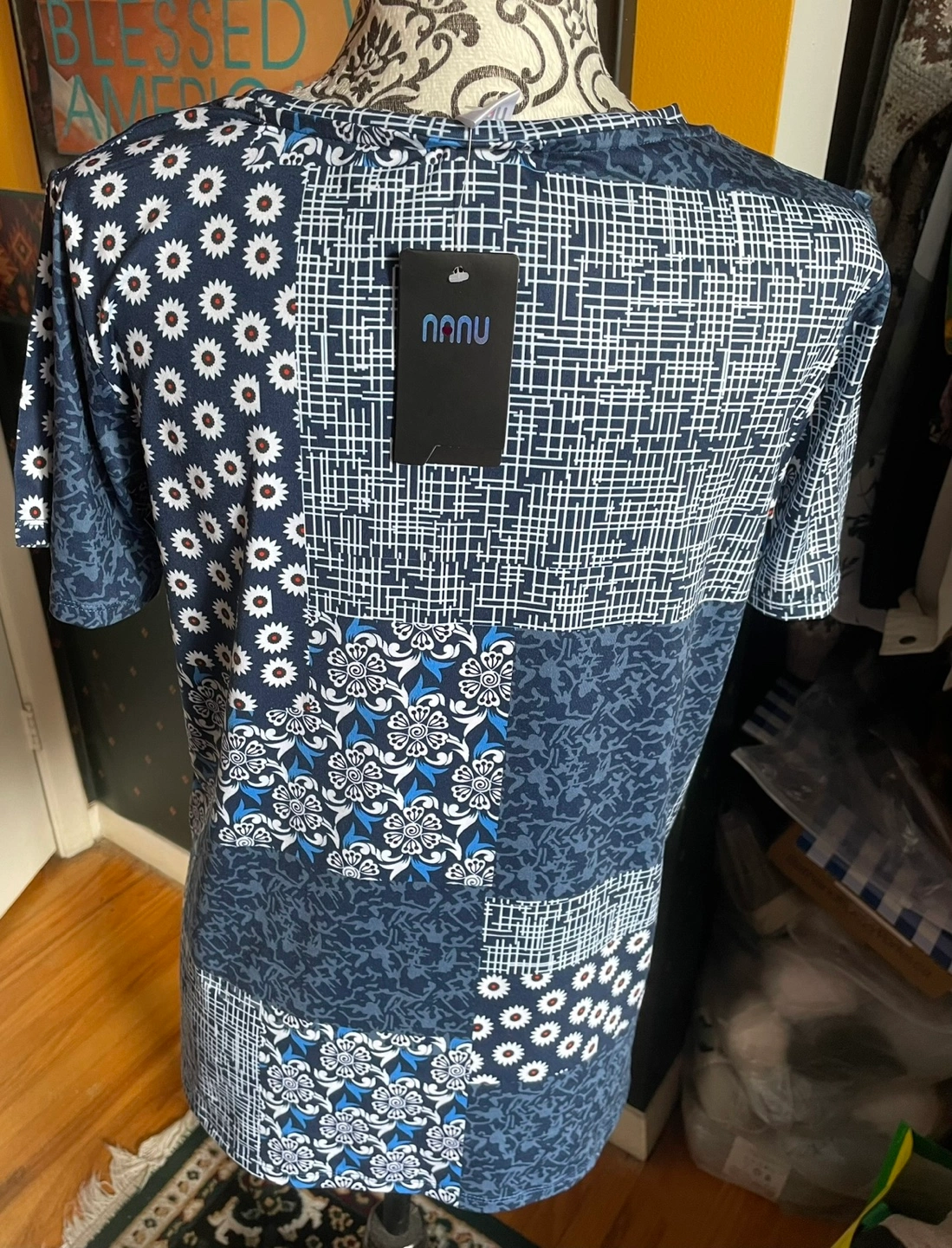 Navy blue with white and light blue patchwork print. Size not specified. Brand new with tag.