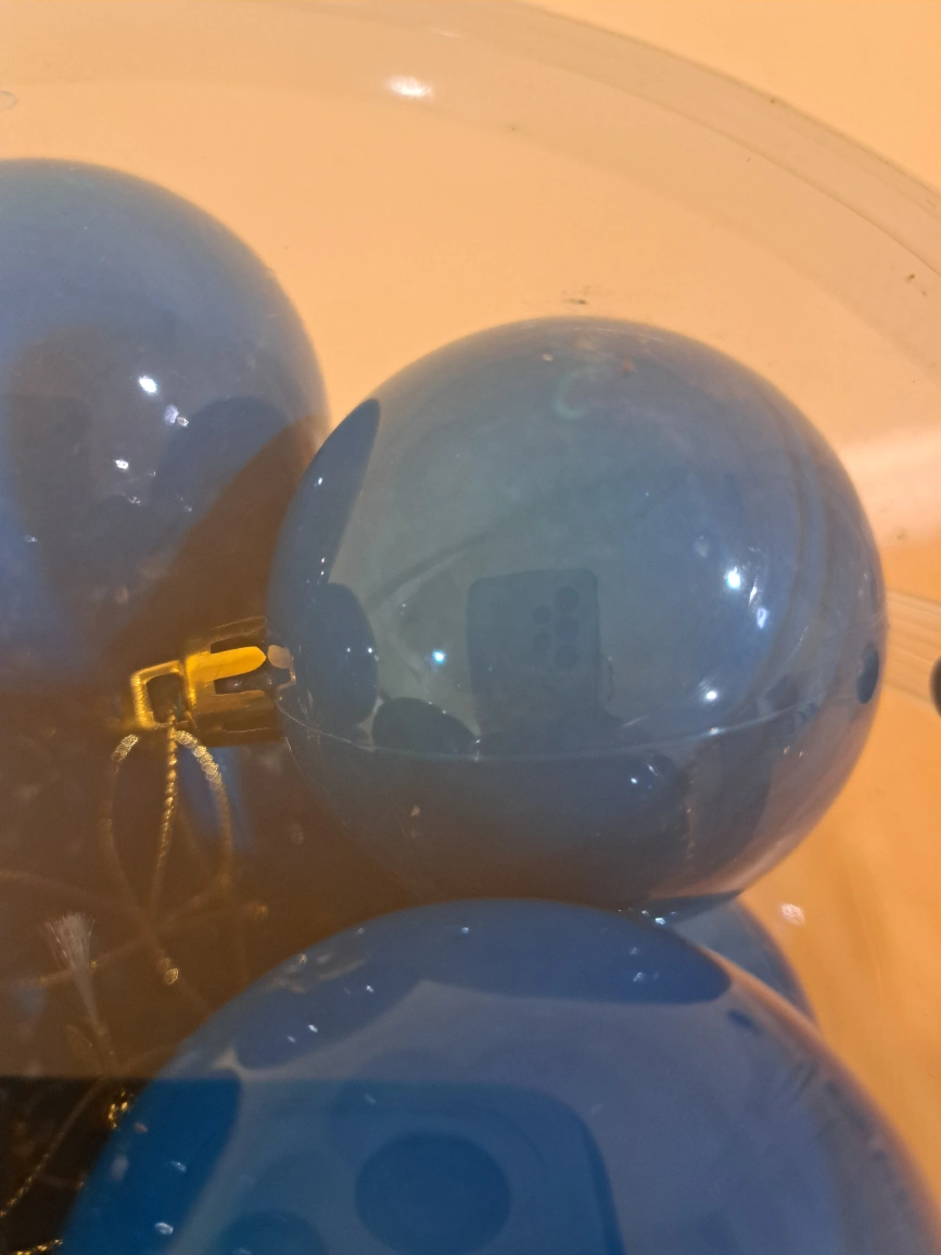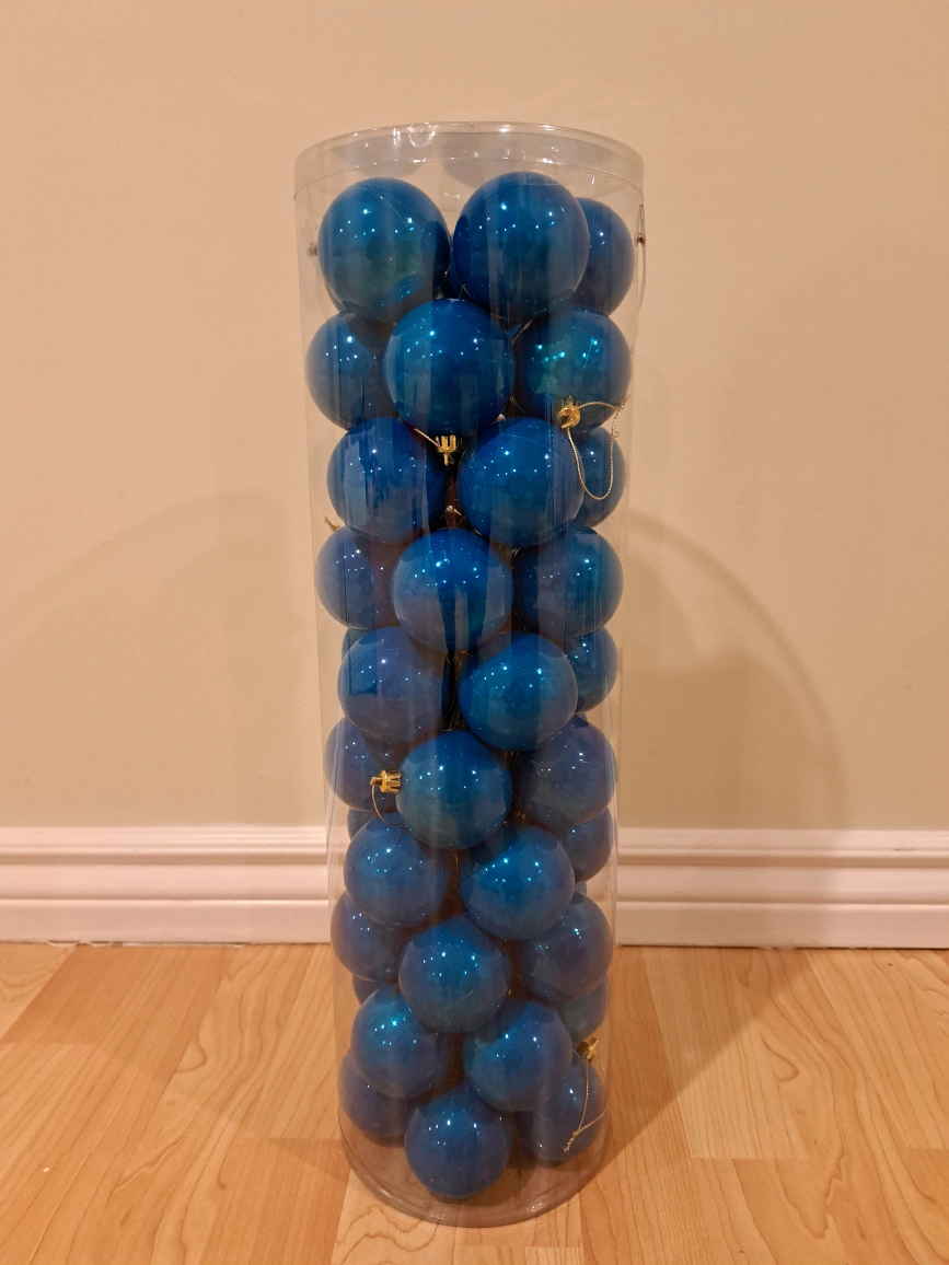 Set of 50 blue Christmas tree ornaments. Shiny finish. Packaged in a clear plastic cylinder. Perfect for decorating your Christmas tree.