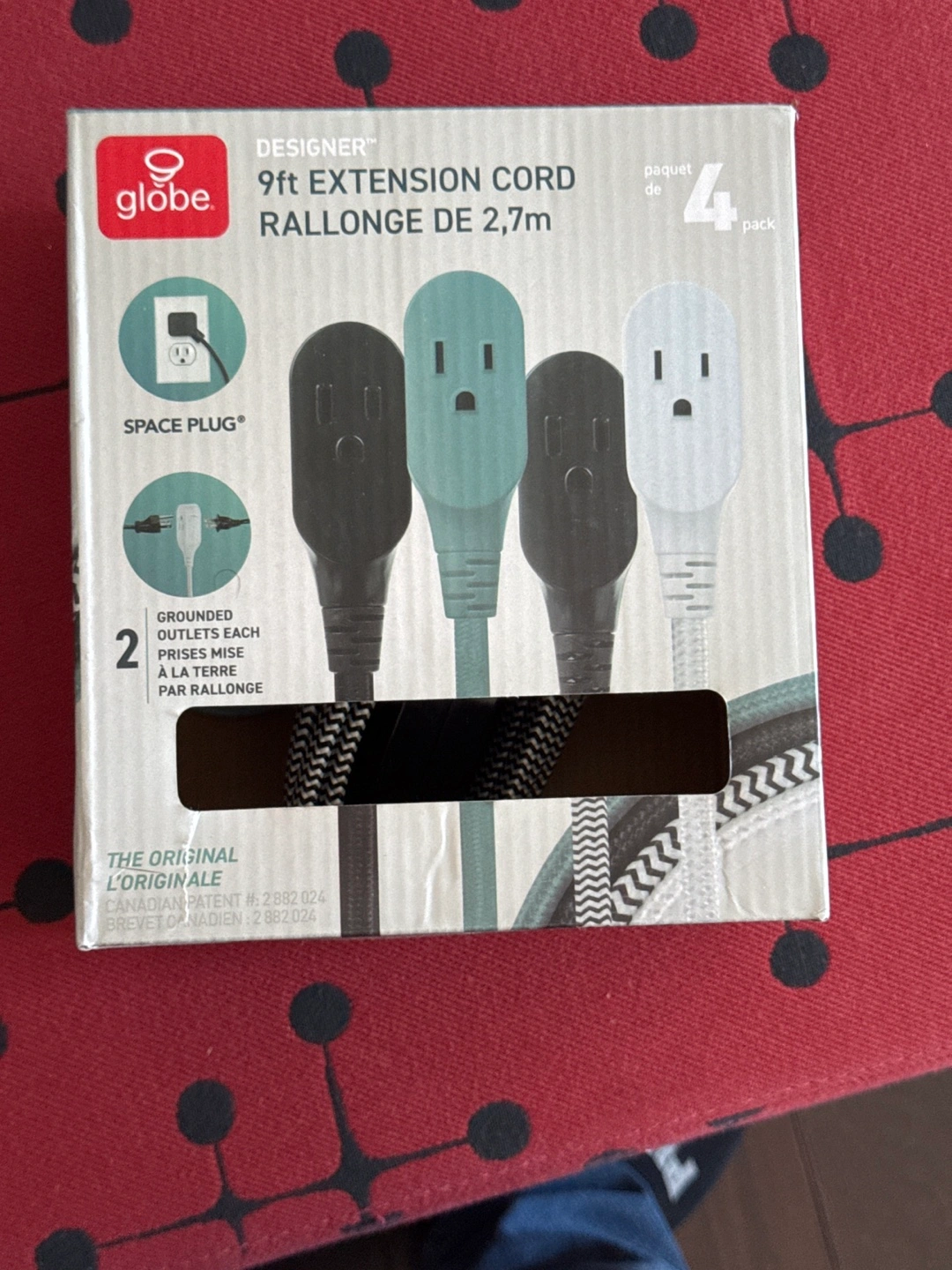 New in box. Four 9-foot grounded extension cords. Space plug design. Zigzag patterned cords. Black, teal, and white.